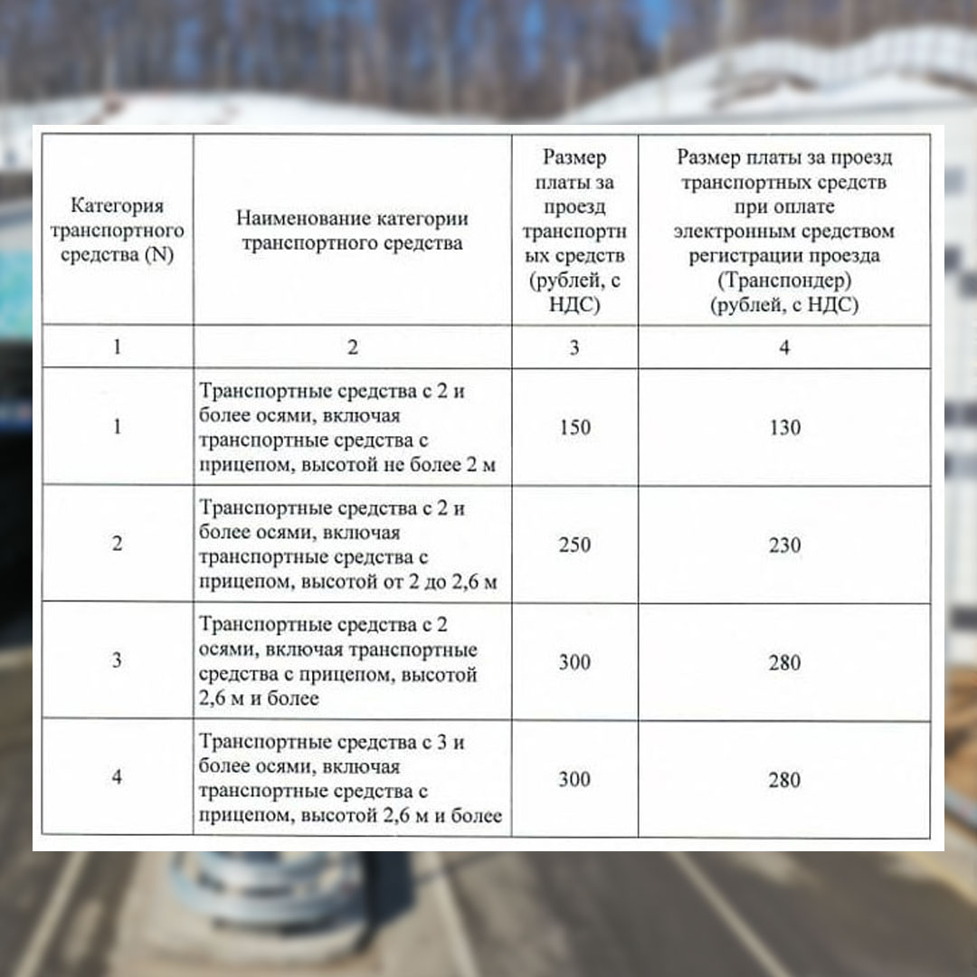 Как сообщили в Минтрансе, водители транспорта высотой до 2 метров должны будут заплатить 150 рублей, высотой от 2 до 2,6 метров — 250 рублей, а свыше 2,6 метров — 300 рублей.