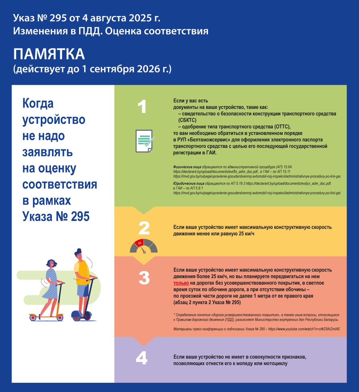 Пункт 2 Указа №295: «Физические и юридические лица, которые имеют в собственности устройства, относящиеся до вступления в силу настоящего Указа к средствам персональной мобильности и имеющие максимальную конструктивную скорость движения более 25 км/ч, вправе: обратиться за их государственной регистрацией в подразделения Государственной автомобильной инспекции Министерства внутренних дел при подтверждении соответствия типам транспортных средств „мопед“ или „мотоцикл“ в соответствии с требованиями технического регламента Таможенного союза „О безопасности колесных транспортных средств“ (TР ТC 018/2011), принятого Решением Комиссии Таможенного союза от 9 декабря 2011 г. №877, в целях их дальнейшего участия в дорожном движении».