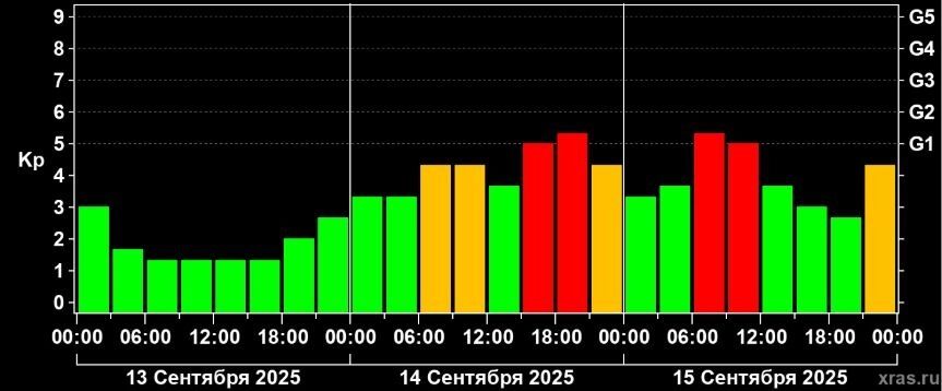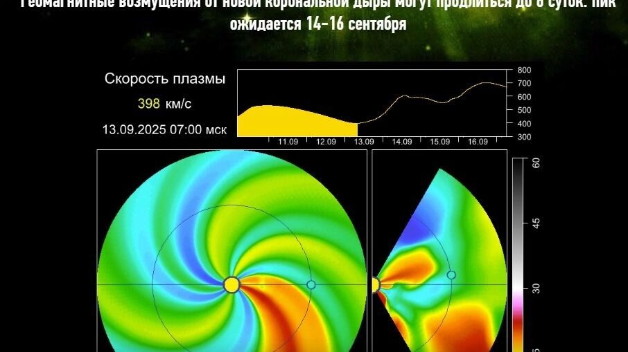 Как пояснили сотрудники Лаборатории солнечной астрономии ИКИ и ИСЗФ, в ближайшие несколько дней геомагнитный индекс Kp попадет под воздействие «качели» коронарных дыр. Причем, скорость солнечного ветра начнет набирать обороты в ночь с 13 на 14 сентября.