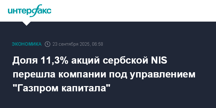 Москва. 23 сентября. INTERFAX.RU - Сменился владелец 11,3% акций сербской нефтяной компании NIS. Вместо ПАО "Газпром" им стало АО "Интэлидженс", сообщила NIS.
