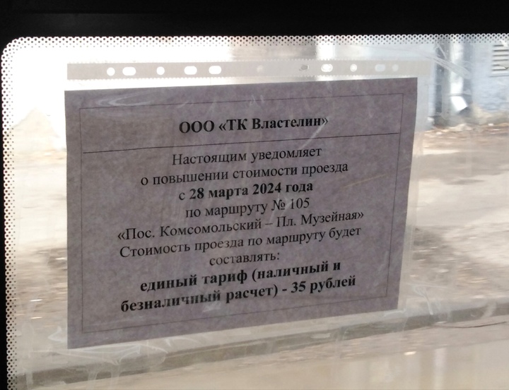 Перевозчик ТК «Властелин», обслуживающий маршрут № 105 (ул. Челюскинцев – пос. Комсомольский) объявил о повышении стоимости проезда с 28 марта. Вместо 30 рублей билет будет стоить 35, причем как для при наличной, так и безналичной оплате.