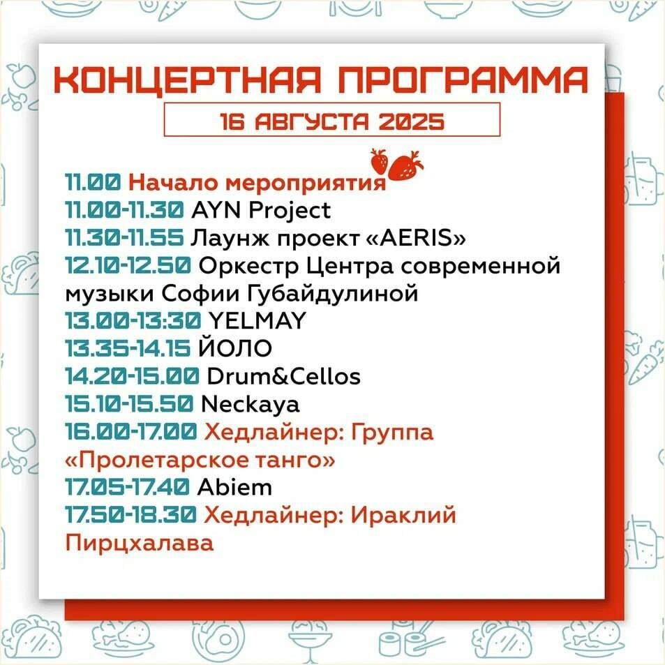 На майдане Лебяжьего 16 августа пройдет «Гастрофест», который продлится с 10:00 до 18:30. Гостей ждут разнообразные блюда, кулинарные мастер-классы от Гильдии поваров Республики Татарстан, а также музыкальные выступления – участника «Фабрики звезд» Ираклия Пирцхалава и ВИА «Пролетарское танго».