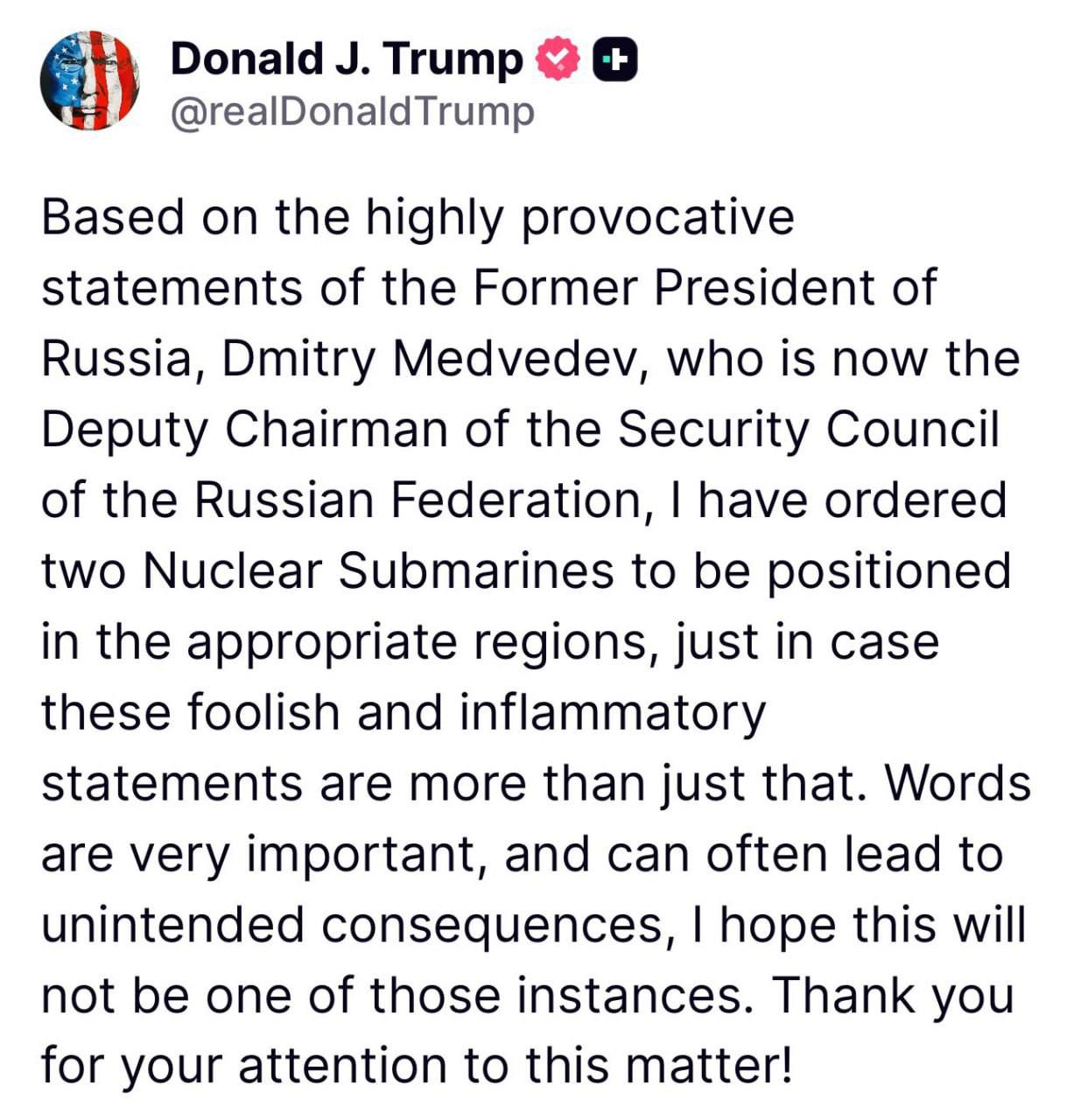 Трамп объявил о размещении "в соответствующих регионах" двух атомных подводных лодок (т.е. носителей ядерного оружия) в ответ на "крайне провокационные" заявления Медведева.