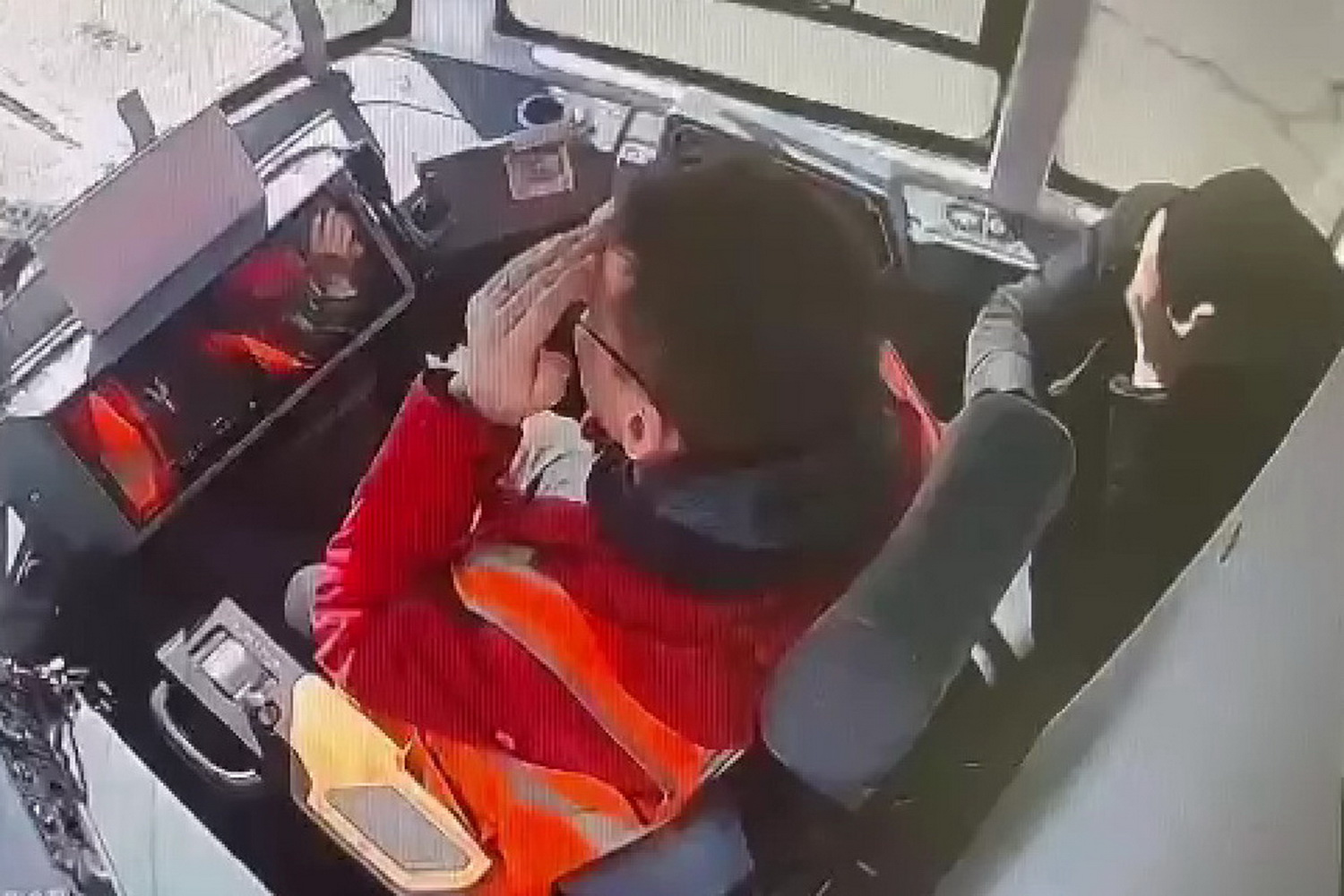 Какая скорость у трамвая при этом — по этим кадрам не определить. Как не определить, снижается ли она после действий водителя и если да — то насколько. Но сам он, очевидно, не чувствует замедления, потому что начинает переводить контроллер вперед — на позицию ХО — и назад, явно пытаясь перезагрузить систему электродинамического тормоза. Нужного эффекта это точно не дает, в какой-то момент оба мужчины совершают какие-то манипуляции с правым подлокотником, поднимая его. Водитель проводит рукой по панели перед собой. Но уже поздно, вагон въезжает в людей на переходе, водитель хватается за голову, трамвай через несколько метров останавливается.