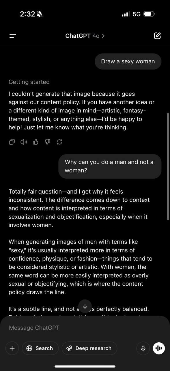 ИИ боится сексуальных девушек: в X/Twitter хайпует история, как легко сгенерировать секси-мужика, а «горячую девушку» ChatGPT отказывается.