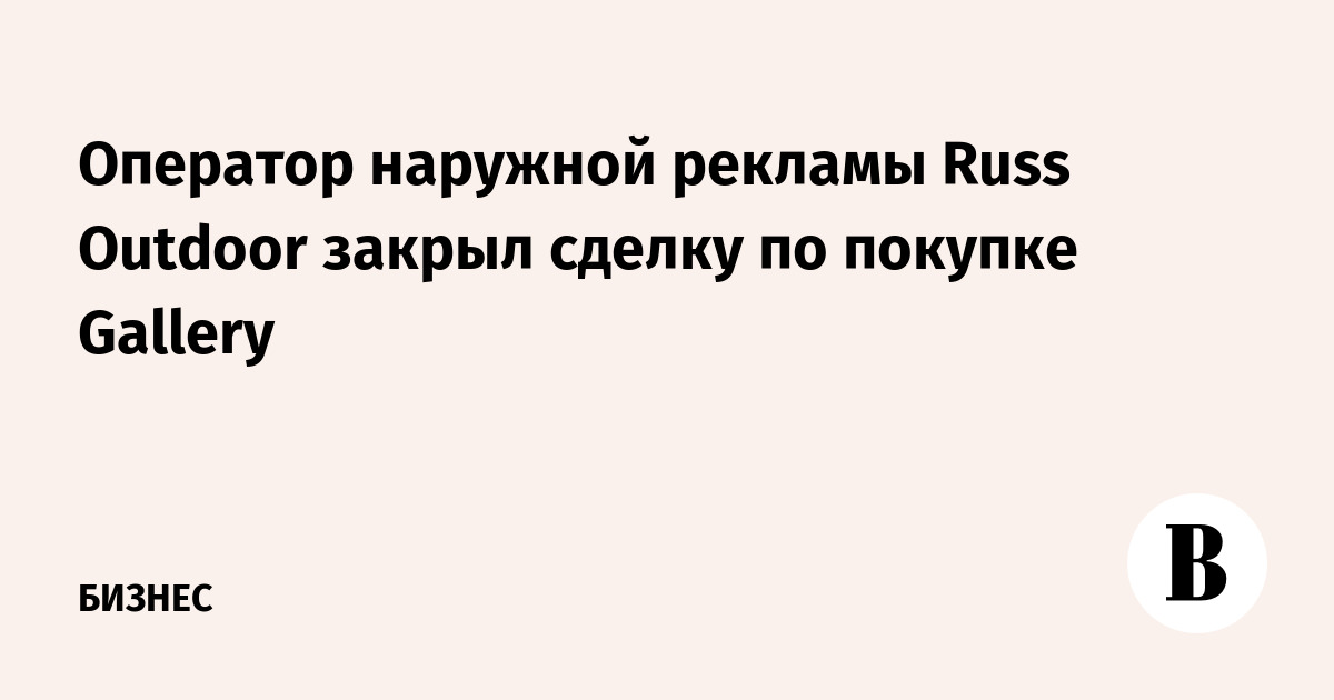 Крупнейший оператор наружной рекламы ГК Russ Outdoor (на 83% принадлежит ООО «Стинн») закрыл сделку по покупке 100% компании Gallery, которая является вторым по величине оператором. Об этом свидетельствуют данные ЕГРЮЛ. Также информацию о закрытии сделки «РИА Новости» подтвердили в пресс-службе ГК Russ.