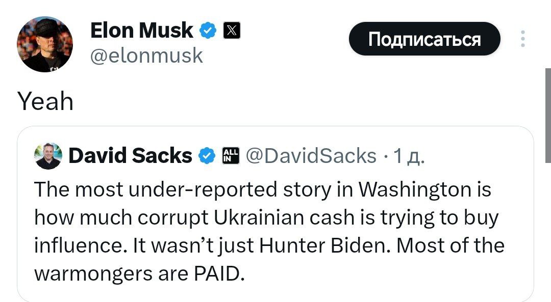 «Самая недооцененная история в Вашингтоне — это то, сколько коррупционных украинских денег пытаются купить влияние. Это был не только Хантер Байден. Большинству поджигателей войны платят», - согласился Илон Маск с американским миллиардером Дэвидом Саксом в социальной сети.