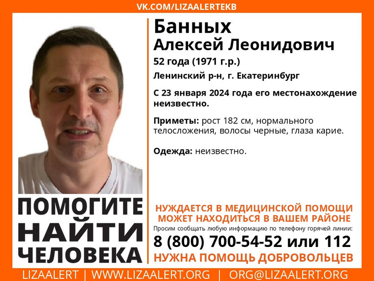 «Помогите найти человека! Пропал Банных Алексей Леонидович, 52 года (1971 г. р.) Ленинский район, города Екатеринбурга. С 23 января 2024 года его местонахождение неизвестно. Нуждается в медицинской помощи», — написали волонтеры регионального отделения «ЛизаАлерт» в группе с соцсети «ВКонтакте».