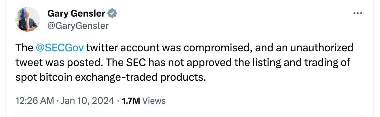 Глава SEC Гэри Генслер срочно опубликовал на своей странице опровержение: «Х-аккаунт SEC был взломан, и был опубликован несанкционированный пост. SEC не одобрила листинг и торговлю спотовыми биржевыми продуктами биткоина». https://t.me/banksta/46772