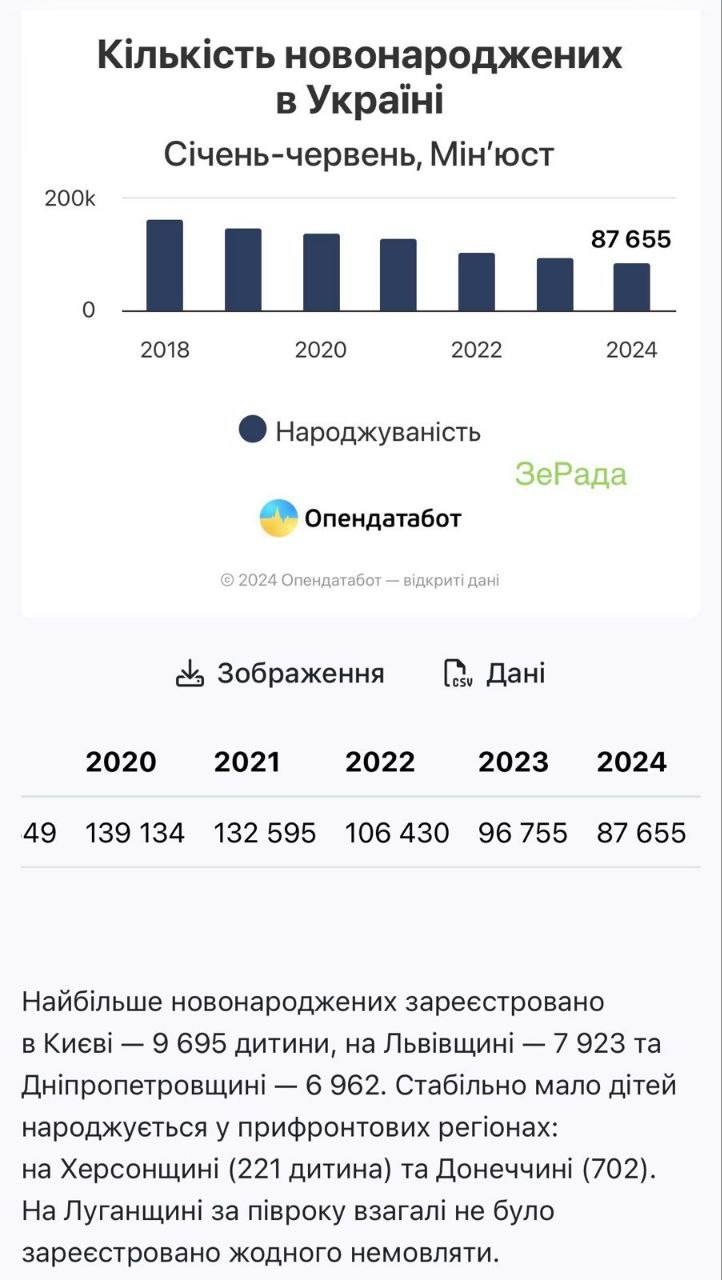 ΠΠ° ΠΏΠ΅ΡΠ²ΠΎΠ΅ ΠΏΠΎΠ»ΡΠ³ΠΎΠ΄ΠΈΠ΅ 2024Π³. Π² Π£ΠΊΡΠ°ΠΈΠ½Π΅ ΡΠΌΠ΅ΡΠ»ΠΈ 250 972 ΡΠ΅Π»., Π° ΡΠΎΠ΄ΠΈΠ»ΠΎΡΡ 87 655 Π΄Π΅ΡΠ΅ΠΉ, ΡΡΠΎ Π½Π° 9% ΠΌΠ΅Π½ΡΡΠ΅, ΡΠ΅ΠΌ Π·Π° Π°Π½Π°Π»ΠΎΠ³ΠΈΡΠ½ΡΠΉ ΠΏΠ΅ΡΠΈΠΎΠ΄ 2023Π³.