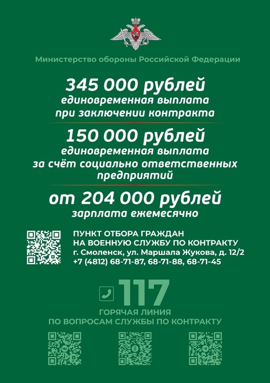 Поступающие на военную службу и заключающие контракт от 1 года получают единовременную выплату в размере от 345 тысяч рублей. Для родственников контрактников, добровольцев и мобилизованных смолян функционирует специальная платформа «Za Добро», внедрена социальная дисконтная карта «Zа Добро», с ними также работают социальные кураторы из Центра поддержки участников СВО и членов их семей (г. Смоленск, ул. Пригородная, 4, тел. 8 (4812) 22-98-00). В Смоленской области по поручению Президента также открыт региональный филиал Фонда «Защитники Отечества» (г. Смоленск, ул. Кловская, 13), специалисты которого занимаются поддержкой ветеранов СВО и членов их семей в части персонального сопровождения по всем возникающим вопросам.