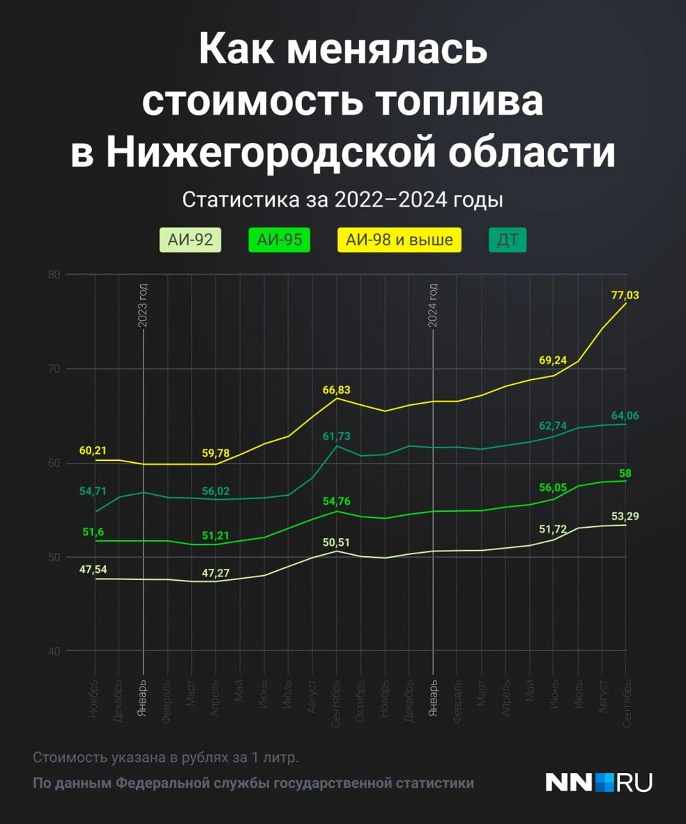 В сентябре 2024 года федеральный Росстат снова объявил о повышении цен производителей на бензин. По стране стоимость топлива снова увеличилась на 1%. Однако в Нижегородской области, по данным службы государственной статистики, в период с август по сентябрь выявили снижение цены на 2,9%.