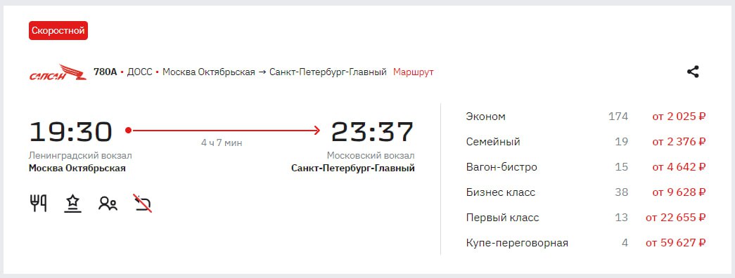 «Сапсан» между Москвой и Санкт-Петербургом в Новый год будет стоить 2025 рублей