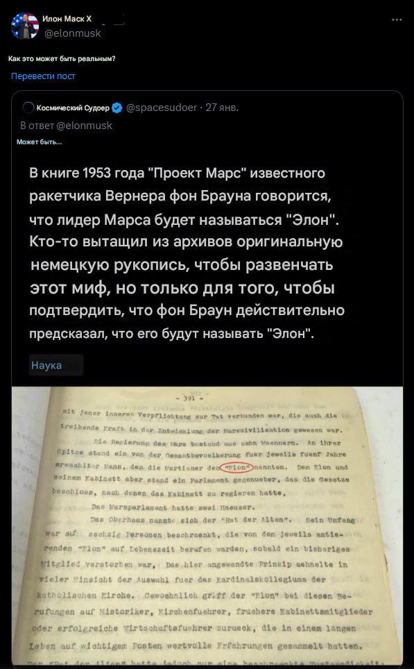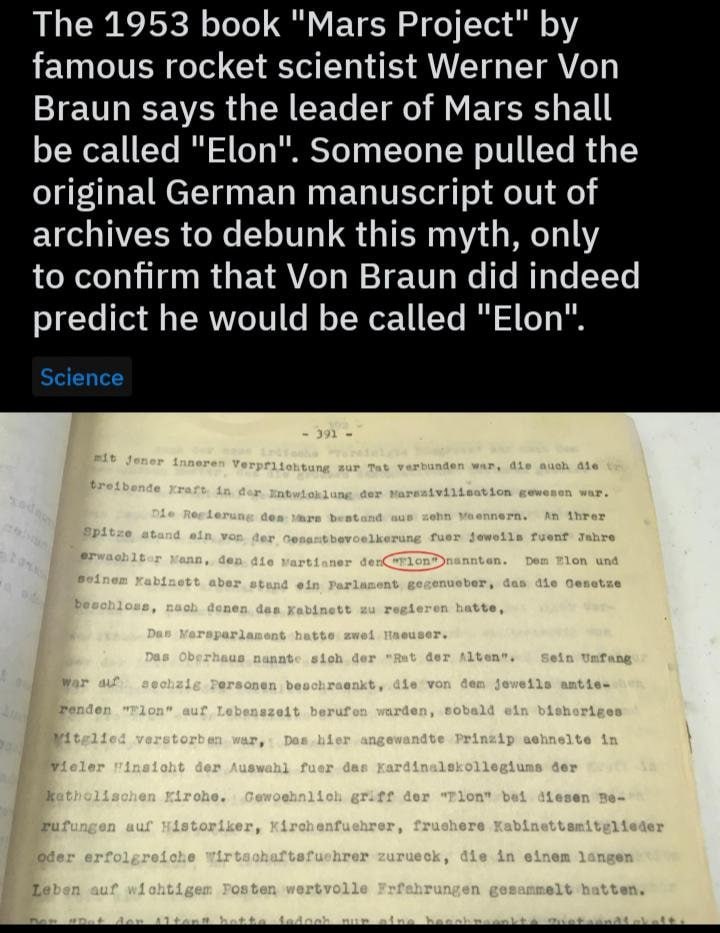 Космослон поделился в Х интересной находкой: в книге «Марсианский проект» 1953 года, основоположник ракетостроения Вернер фон Браун утверждал, что «лидером Марса будет Илон».