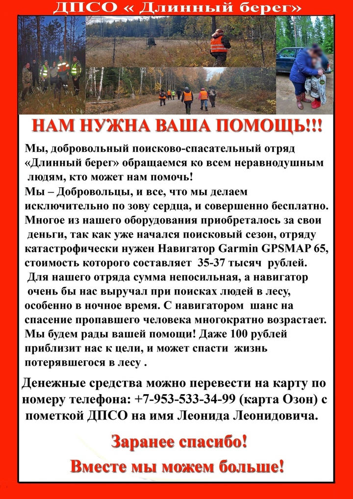 В паблике поисковиков Олонецкого района «Длинный берег» опубликовано сообщение с просьбой помочь приобрести GPS- Навигаторе Garmin 65. Прибор необходим для поиска пропавших людей.
