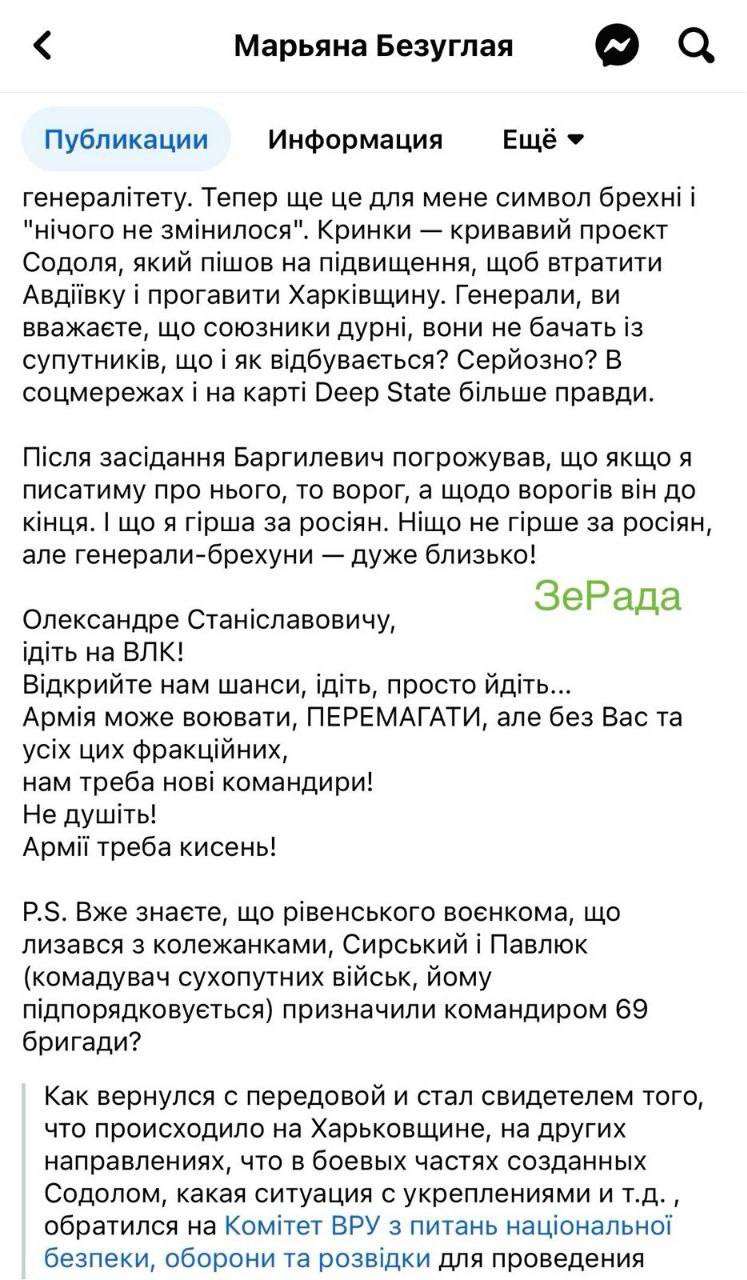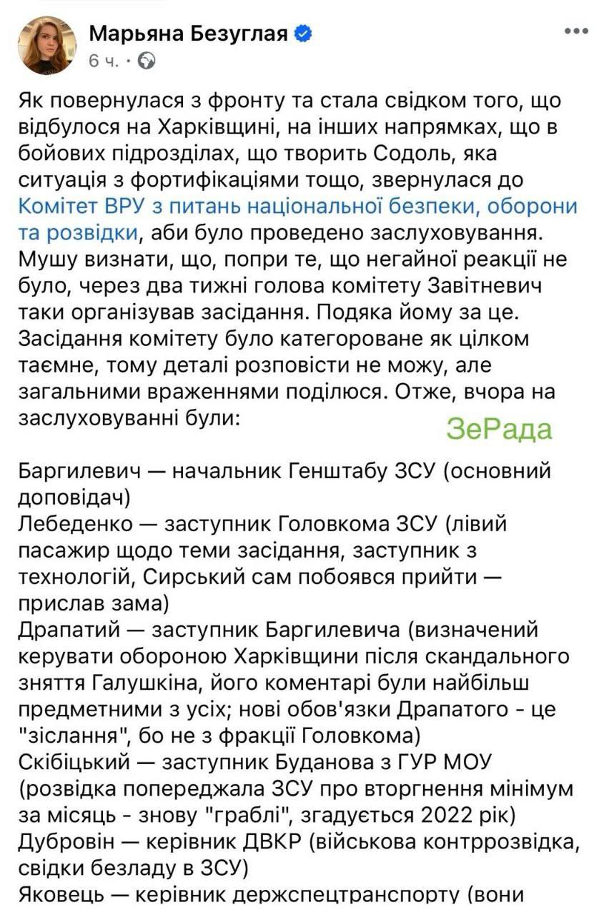 Марьяна Безуглая не унимается и продолжает безжалостно критиковать командование ВСУ. Лично увидев происходящее на фронте на Харьковщине, с боевыми подразделениями и с фортификациями, она делится некоторыми деталями заслушивания докладов руководства ВСУ на тайном заседании профильного комитета по обороне ВР.