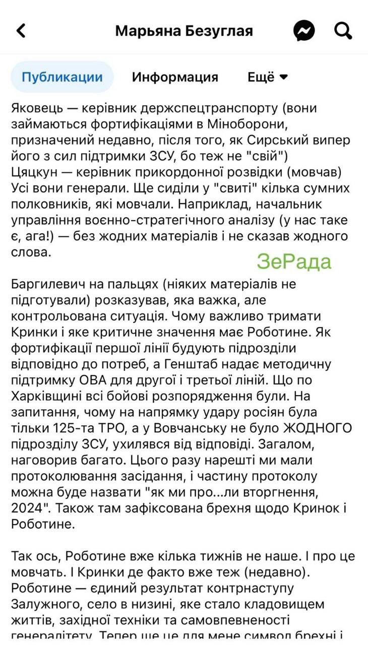 - протокол заседания она назвала «как мы про..али вторжение, 2024»; в котором зафиксировано вранье генералов по Крынкам и Работино;