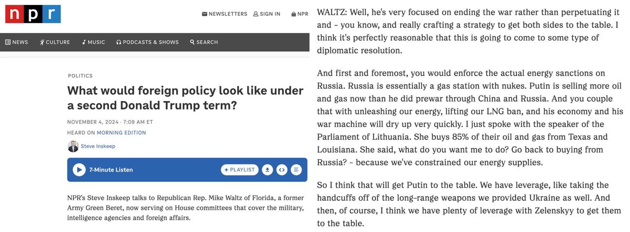Конгрессмен Майк Уолтц, которого СМИ называют будущим помощником Трампа по нацбезопасности, незадолго до выборов рассказывал, как республиканец в случае победы мог бы заставить Украину и РФ заключить мирное соглашение.