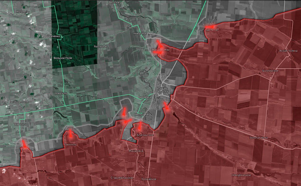 Важный пункт обороны украинских сил на этом участки - Великая Новосёлка вскоре может быть отрезана от основных логистических путей (сейчас они сильно затруднены). И ситуация здесь для ВСУ продолжает ухудшаться, в первую очередь из-за нехватки резервов.