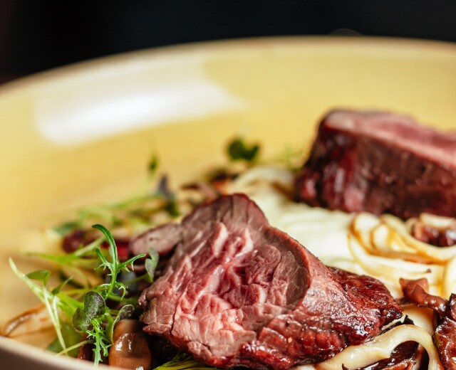 Тут едят: стриплойн, свиные ребра из печи, говяжьи мраморные, томленые в хоспере и грудинку брискет с домашним BBQ. Много авторского и привезенного шефом из дальних гастропутешествий — гриль штука международная.