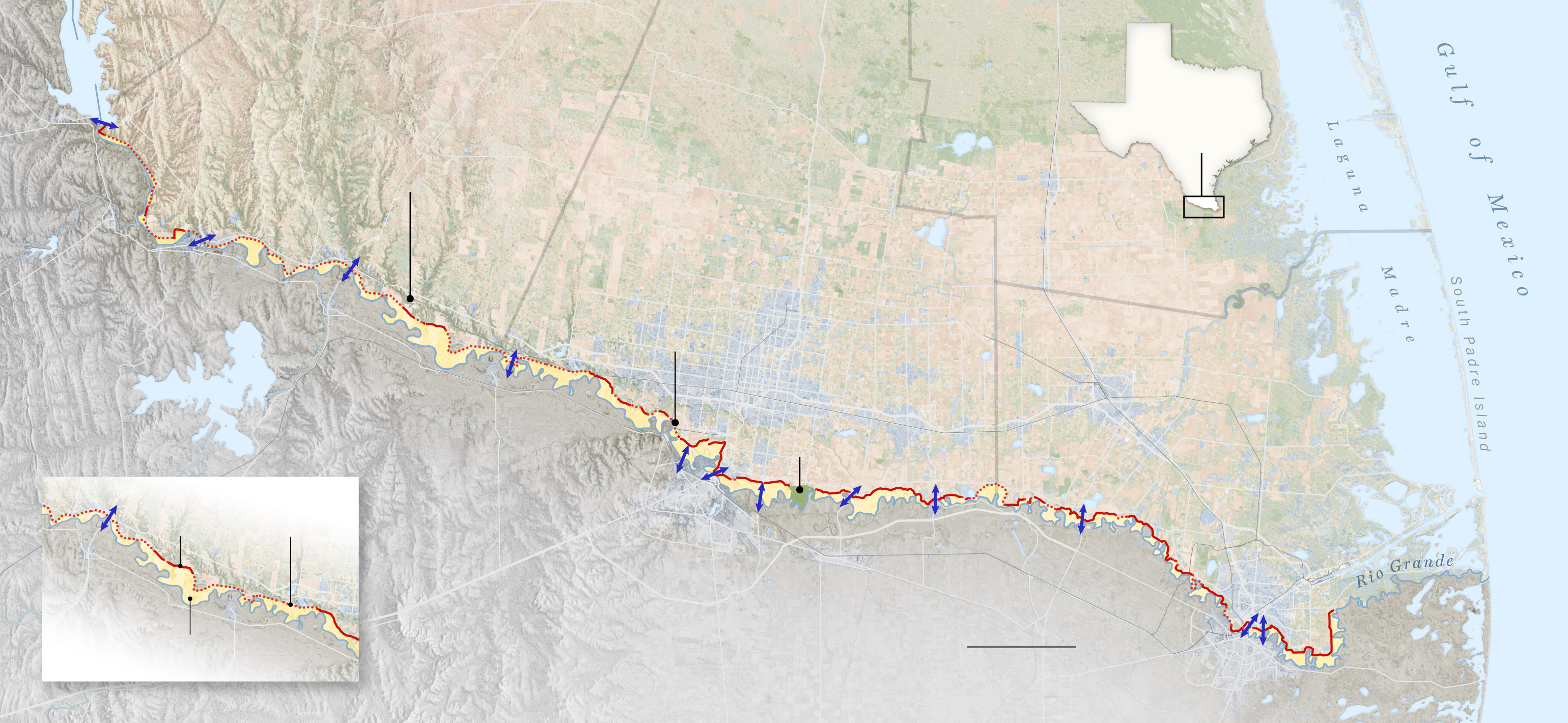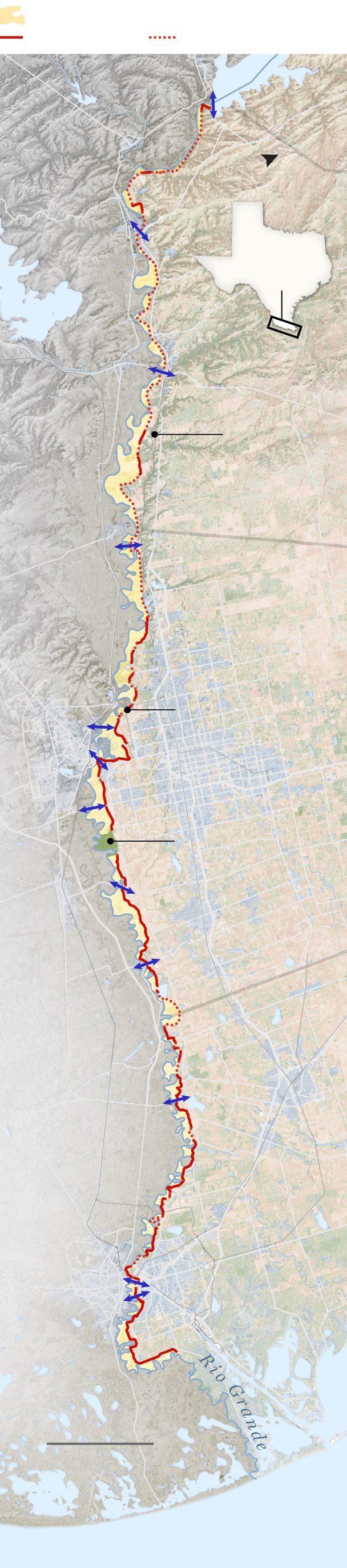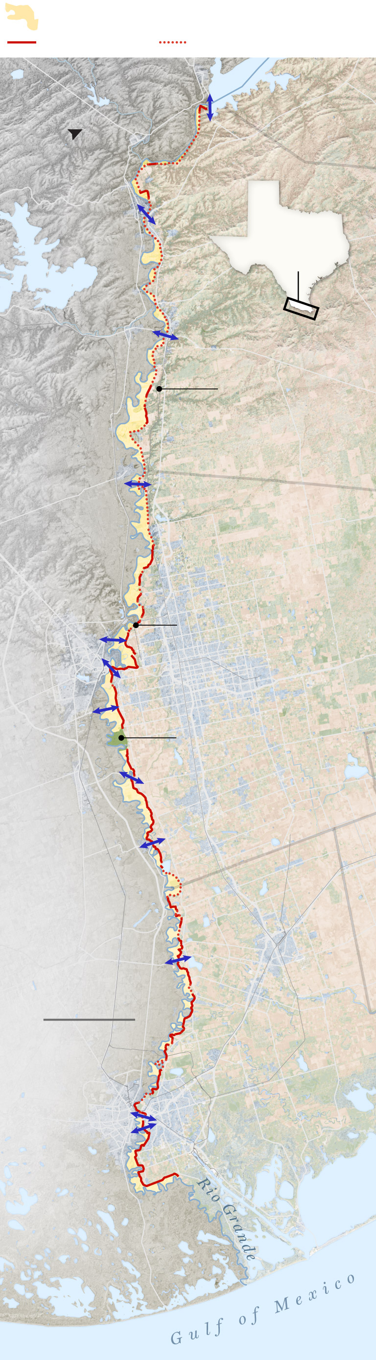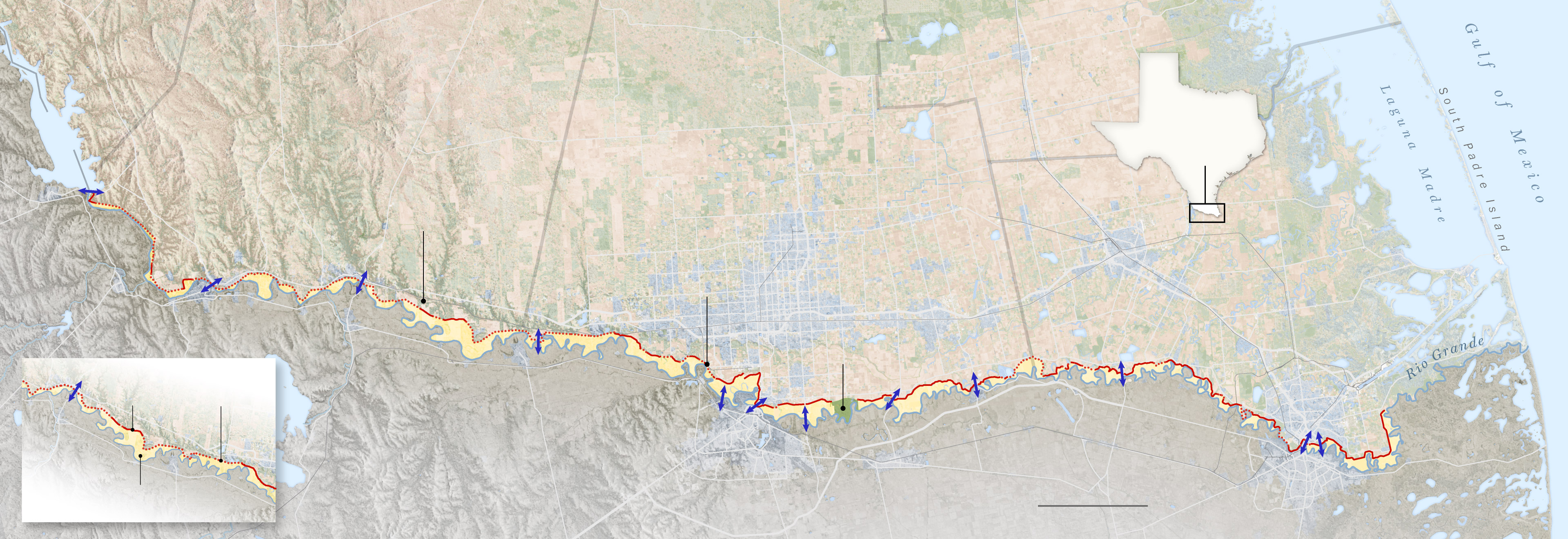 The U.S.-Mexico border is defined in Texas by the Rio Grande, but the government does not install 30-foot-tall steel barriers in the middle of a river, let alone on its looping, unstable banks. So the border wall in South Texas isn’t built on the border.