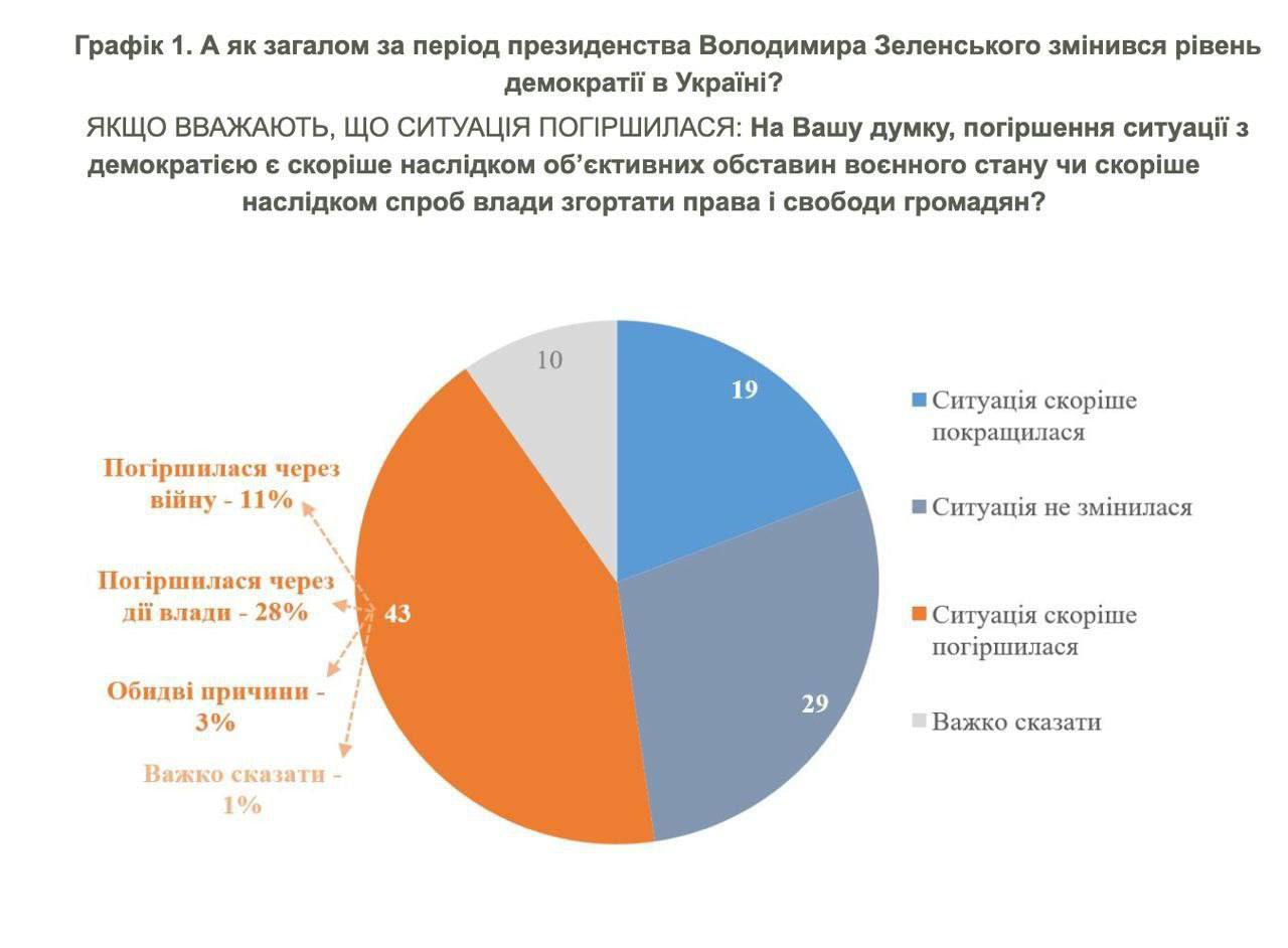 ✅ Из 43%, уверенных в ухудшении демократических процессов: 28% уверены, что причина их ухудшения - попытки власти ограничить права и свободы граждан. А 11% - это ухудшение из-за войны.