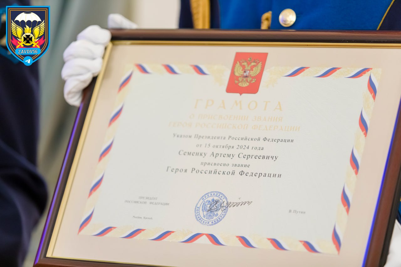 14 ноября, в Центральном Доме Российской Армии состоялась церемония передачи медали «Золотая Звезда» родным брянского офицера-десантника, гвардии старшего лейтенанта Артема Семенка.