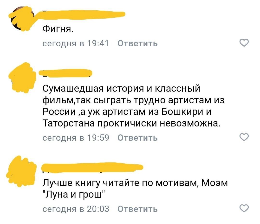 «Сумасшедшая история и классный фильм, так сыграть трудно артистам из России, а уж артистам из Бошкири Таторстана проктичиски невозможна».