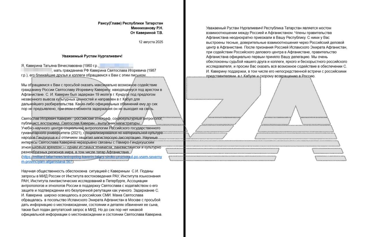 Татьяна Каверина написала письмо главе республики Рустаму Минниханову с просьбой посодействовать вызволению её сына из афганской тюрьмы. Дело в том, что после признания Россией Исламского Эмирата Афганистан талибы первой приняли делегацию именно из Татарстана. Поэтому мать этнографа выразила надежду на то, что у главы республики есть возможность помочь ее сыну.