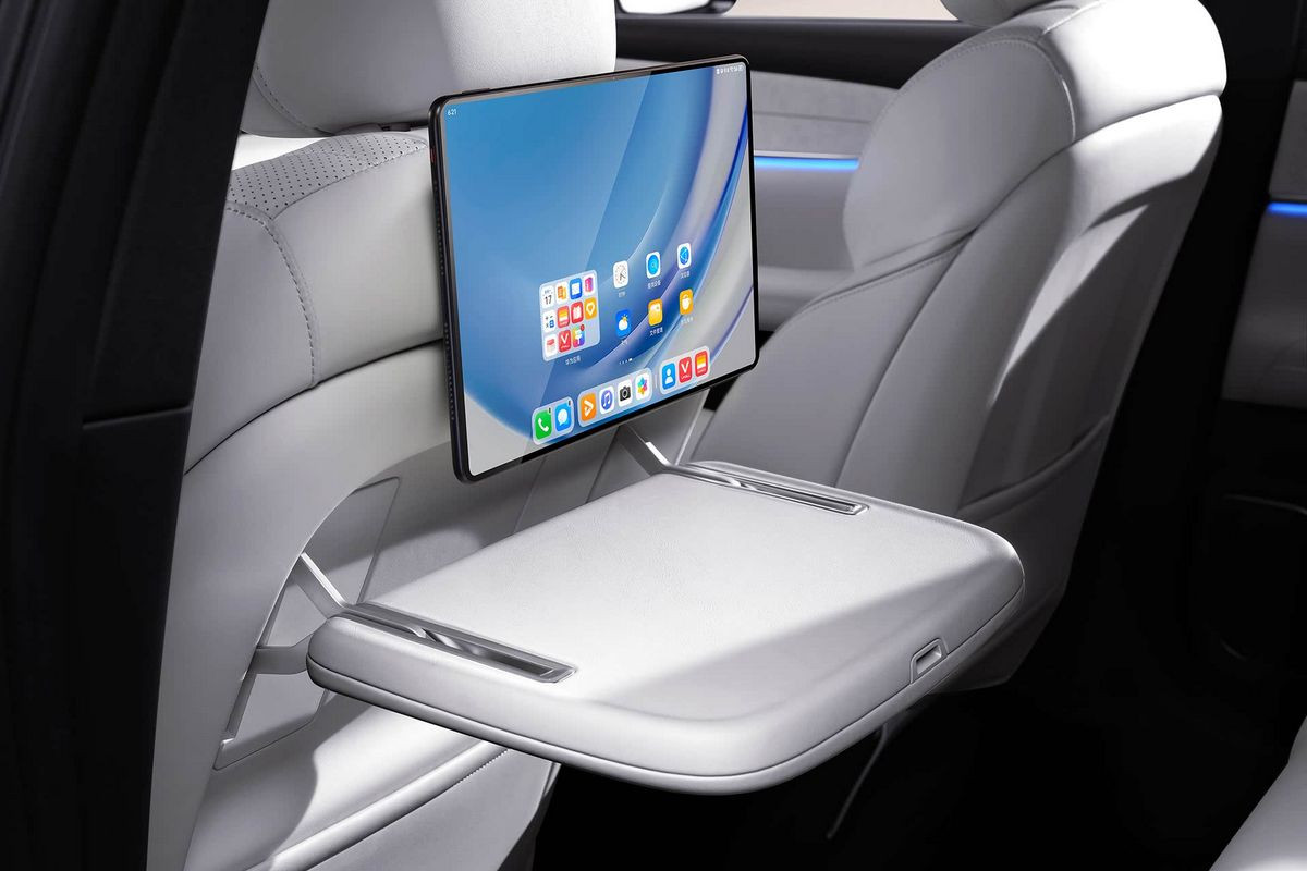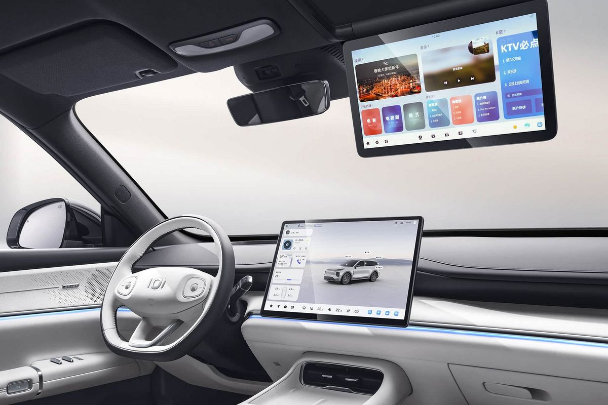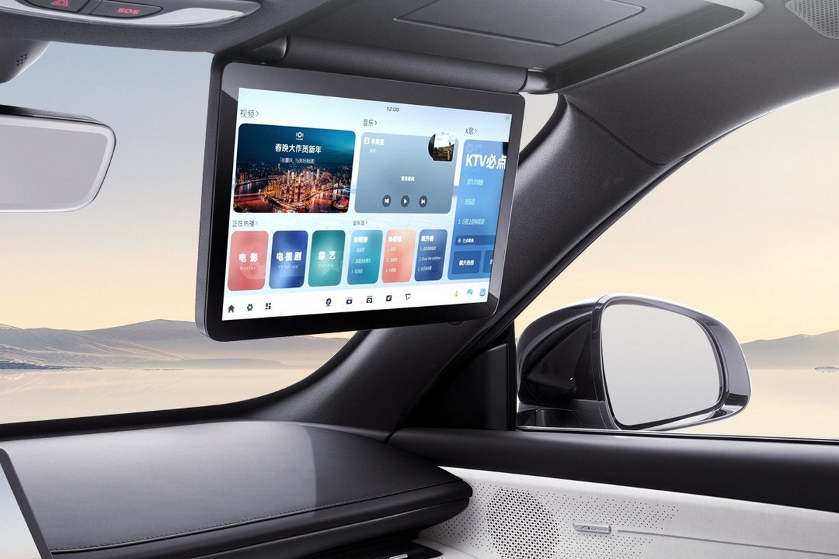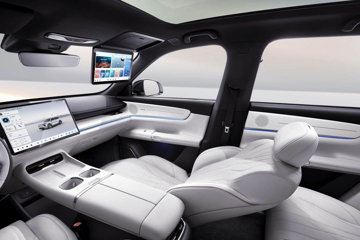 В пятиместном салоне нет привычных приборки и селектора трансмиссии, вместо них – проекционный дисплей и подрулевой рычажок. Двери открываются с помощью кнопок. По центру установлен гигантский тачскрин мультимедийной системы (мультимедиа – с искусственным интеллектом DeepSeek), который можно наклонять в сторону водителя или пассажира. В пассажирский козырек может быть встроен дополнительный дисплей, причем довольно крупный. Отдельный планшет предусмотрен и для задних седоков – он крепится к спинке переднего кресла.