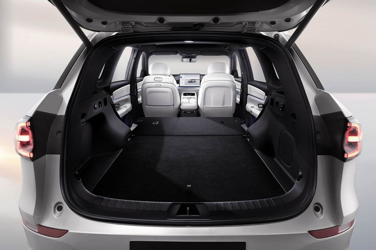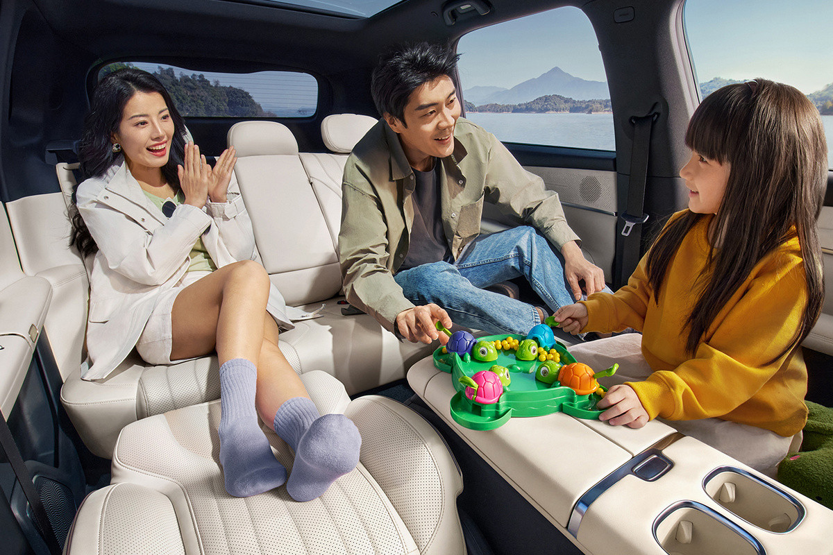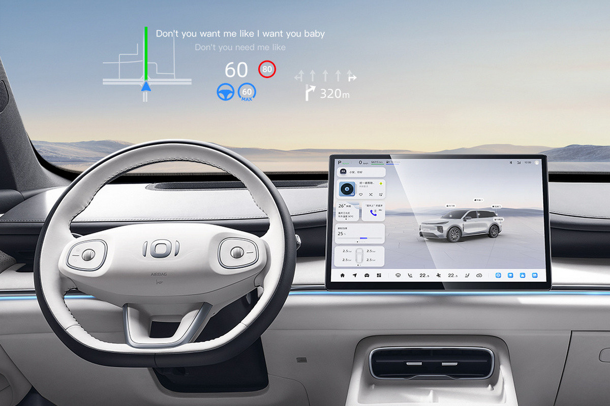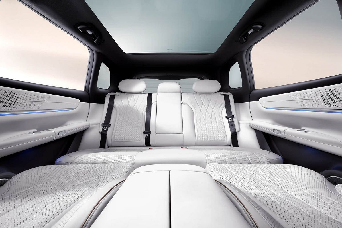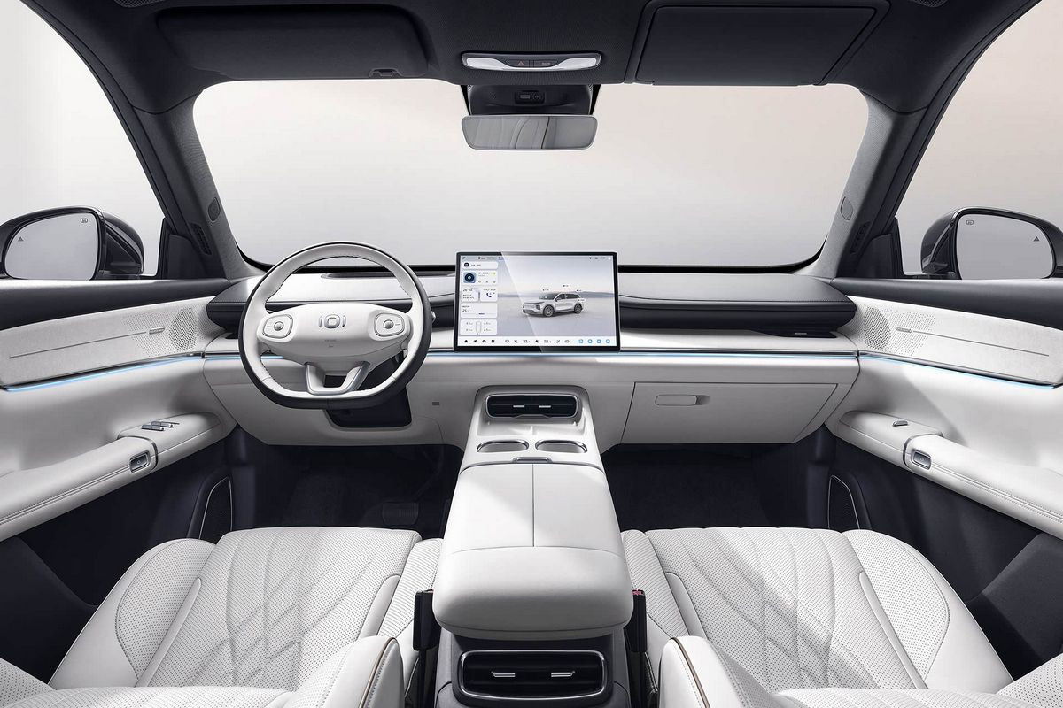 В пятиместном салоне нет привычных приборки и селектора трансмиссии, вместо них – проекционный дисплей и подрулевой рычажок. Двери открываются с помощью кнопок. По центру установлен гигантский тачскрин мультимедийной системы (мультимедиа – с искусственным интеллектом DeepSeek), который можно наклонять в сторону водителя или пассажира. В пассажирский козырек может быть встроен дополнительный дисплей, причем довольно крупный. Отдельный планшет предусмотрен и для задних седоков – он крепится к спинке переднего кресла.