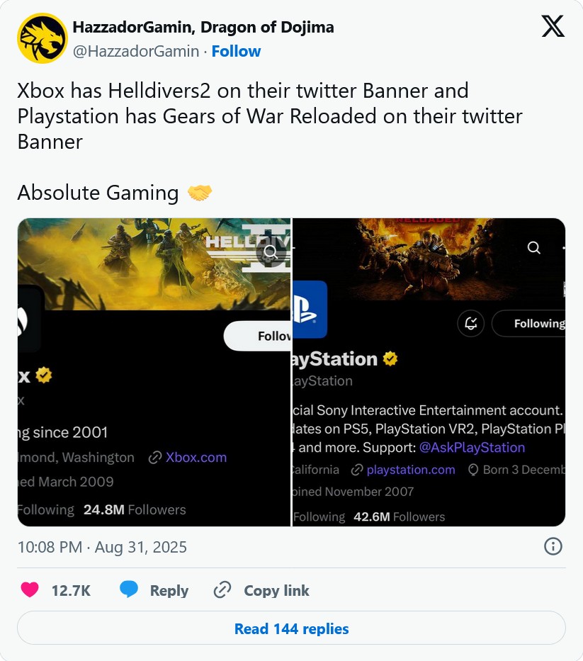 Xbox рекламирует Helldivers 2, а аккаунт PlayStation – Gears of War. Что-то, что мы не могли себе представить и пару лет назад.