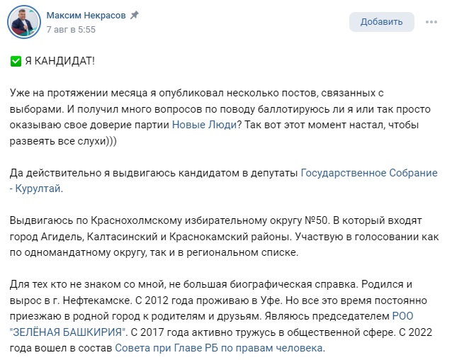Председатель общественной организации «Зеленая Башкирия» Максим Некрасов выдвинулся от партии «Новые люди». Главным конкурентом по округу № 50 ему стала Тамара Тансыккужина – зампредседателя Курултая от Единой России. Вместе с ними от ЛДПР выдвигается также Юрий Рудаков – в прошлом помощник депутата Госдумы Федсобрания Владимира Жириновского по работе в Башкирии. Его Ufa1 назвала самым бедным депутатом Уфы.