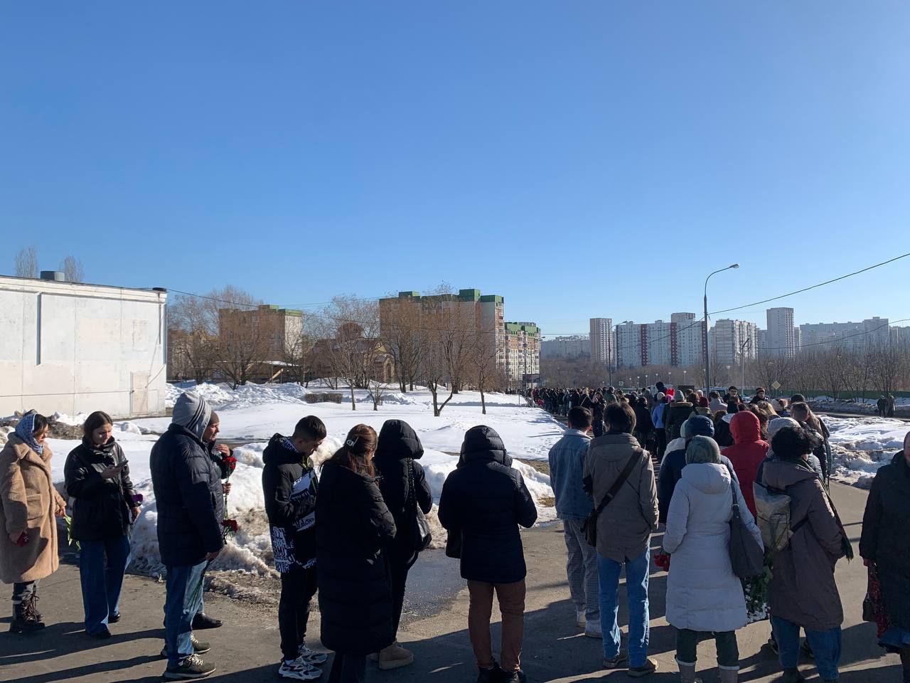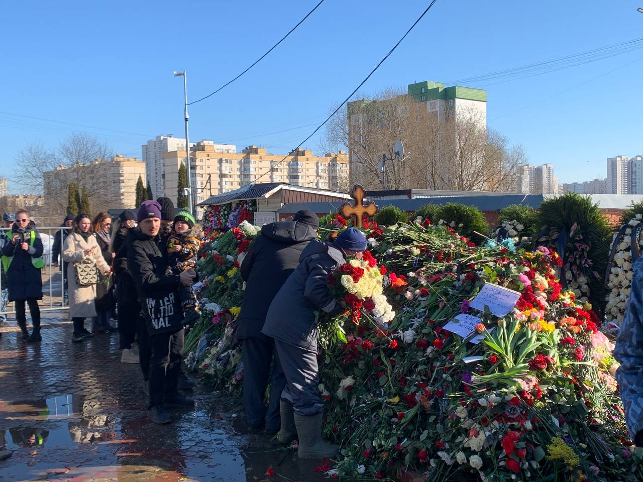 К могиле Алексея Навального до сих пор выстраивается очередь из людей, желающих возложить цветы. Фото и видео: «Новая газета Европа» (иноагент, нежелательная организация).