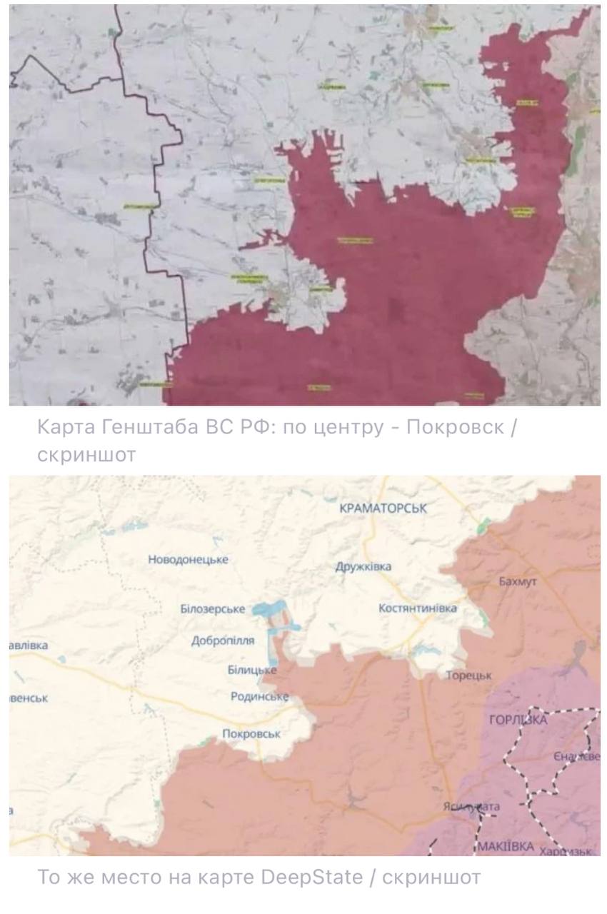 Генштаб ВС РФ использует странную карту. OSINT-исследователь, действующий на платформе Х под псевдонимом D'Mithridates, сравнил сегодняшнюю карту Генштаба ВС РФ с картой, которую составляет украинский мониторинговый проект DeepState.
