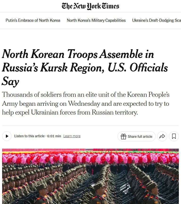 В Курскую область РФ к понедельнику перебросят пять тысяч северокорейских солдат, пишет The New York Times со ссылкой на высокопоставленного украинского чиновника.