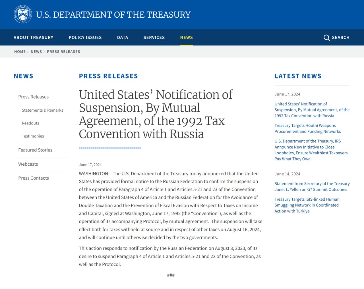 Π Π°ΠΌΠ΅ΡΠΈΠΊΠ°Π½ΡΠΊΠΎΠΌ ΠΠΈΠ½ΡΠΈΠ½Π΅ Π·Π°ΡΠ²ΠΈΠ»ΠΈ, ΡΡΠΎ ΡΡΠΎ ΠΎΡΠ²Π΅Ρ Π½Π° ΡΠΊΠ°Π· ΠΡΡΠΈΠ½Π° ΠΎΡ 8 Π°Π²Π³ΡΡΡΠ° 2023 ΠΎ ΠΏΡΠΈΠΎΡΡΠ°Π½ΠΎΠ²ΠΊΠ΅ Π΄Π΅ΠΉΡΡΠ²ΠΈΡ Π½Π΅ΠΊΠΎΡΠΎΡΡΡ ΠΏΠΎΠ»ΠΎΠΆΠ΅Π½ΠΈΠΉ Π΄ΠΎΠ³ΠΎΠ²ΠΎΡΠΎΠ² ΠΎΠ± ΠΈΠ·Π±Π΅ΠΆΠ°Π½ΠΈΠΈ Π΄Π²ΠΎΠΉΠ½ΠΎΠ³ΠΎ Π½Π°Π»ΠΎΠ³ΠΎΠΎΠ±Π»ΠΎΠΆΠ΅Π½ΠΈΡ Ρ Π½Π΅Π΄ΡΡΠΆΠ΅ΡΡΠ²Π΅Π½Π½ΡΠΌΠΈ Π³ΠΎΡΡΠ΄Π°ΡΡΡΠ²Π°ΠΌΠΈ.