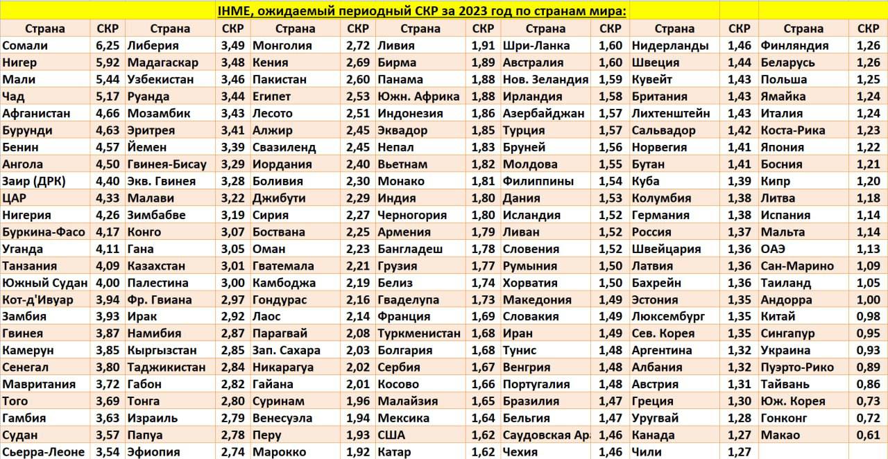 Среди основных целей национальный проект «Демография» указано УВЕЛИЧЕНИЕ СУММАРНОЙ РОЖДАЕМОСТИ. Далее, дабы не расписывать много, две таблицы – одна по Росстату, а вторая - прогноз-оценка рождаемости по странам мира на 2023 год от Института показателей и оценки здоровья (IHME).