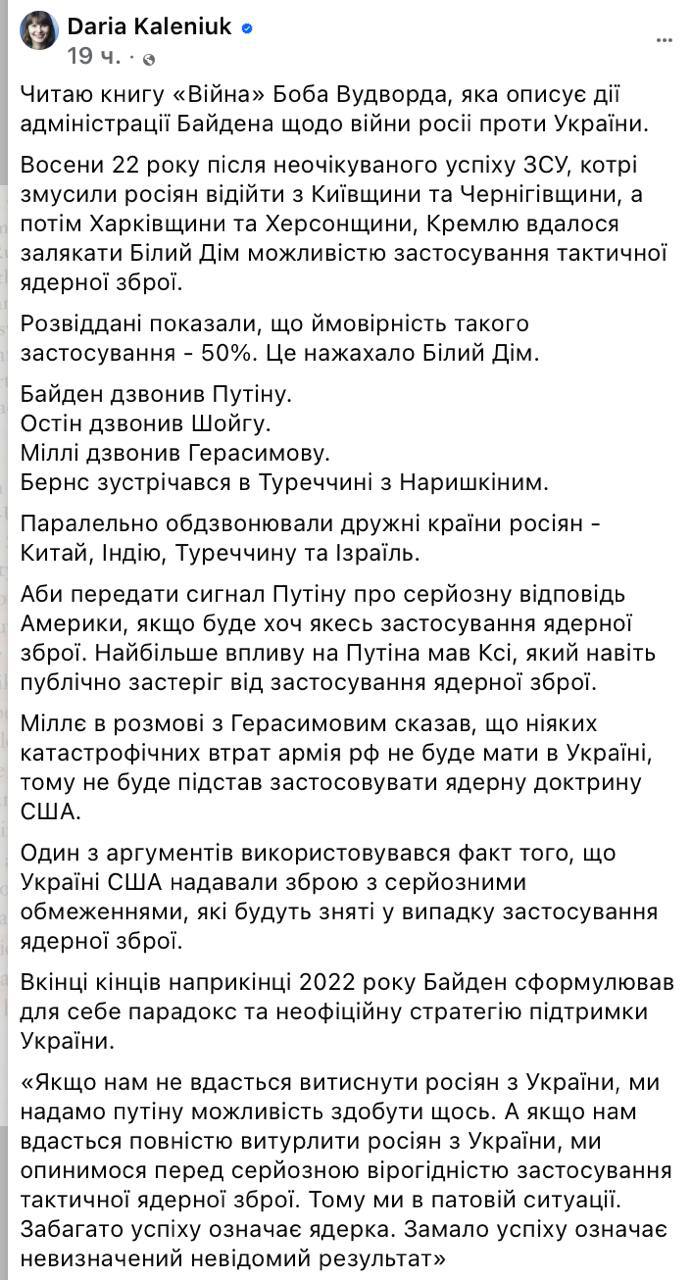 Глава соросятско-грантоедского Центра противодействия коррупции Дарья Каленюк возмутилась правдой о политике Белого дома в отношении Украины и возможностями применения РФ ядерного оружия, описанной в книге американского журналиста Боба Вудворда «Война»: