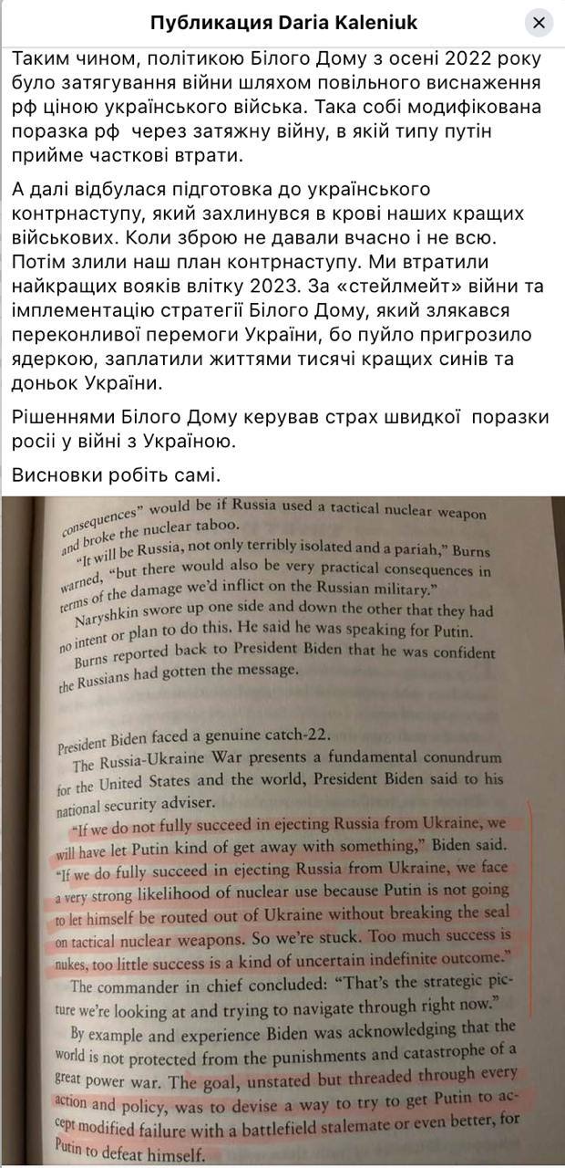 Каленюк констатирует, что «политикой Белого дома с осени 2022 года стало затягивание войны через постепенное истощение России ценой украинской армии. Это была своего рода модифицированная стратегия поражения России через затяжную войну, в которой Путин должен был как бы принять частичные потери».