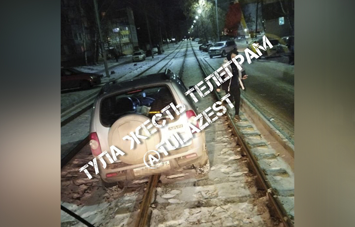 В микрорайоне Криволучье в Туле вечером, 12 декабря, оказалось парализовано движение трамваев. Причиной стал автомобиль «Нива Шевроле», застрявший на трамвайных путях.