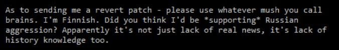 Он отстранил от работы 11 программистов из-за того, что они россияне. Основатель Linux сообщил, что «совершенно ясно, почему было внесено изменение [в список разработчиков], оно не отменяется. <...> Если вы еще не слышали об антироссийских санкциях, вам стоит как-нибудь почитать новости. <...> Я финн. Неужели вы думали, что я буду поддерживать российскую агрессию? Очевидно, дело не только в отсутствии реальных новостей, но и в недостаточном знании истории». https://t.me/banksta/59597