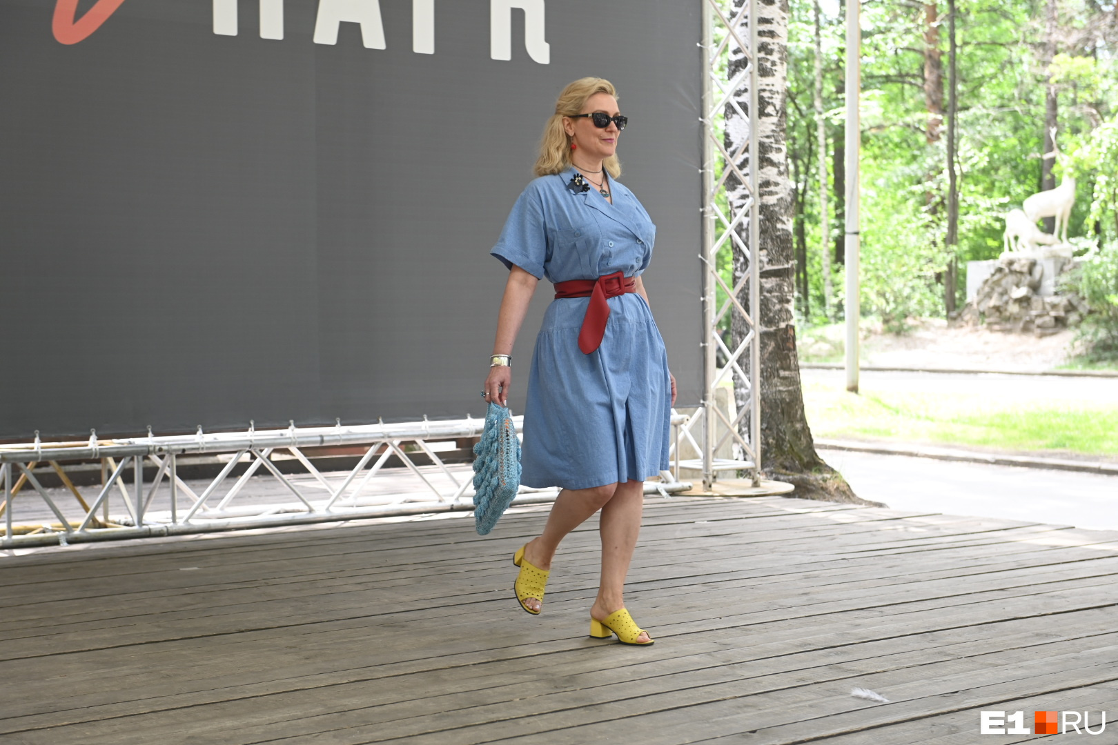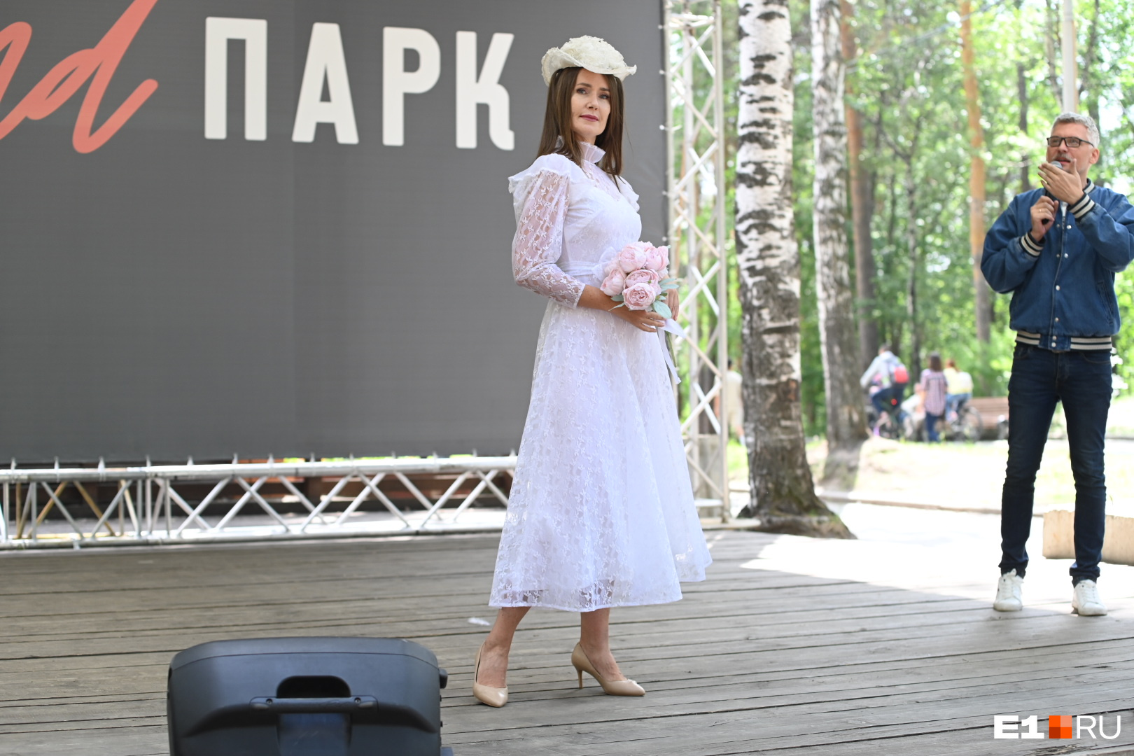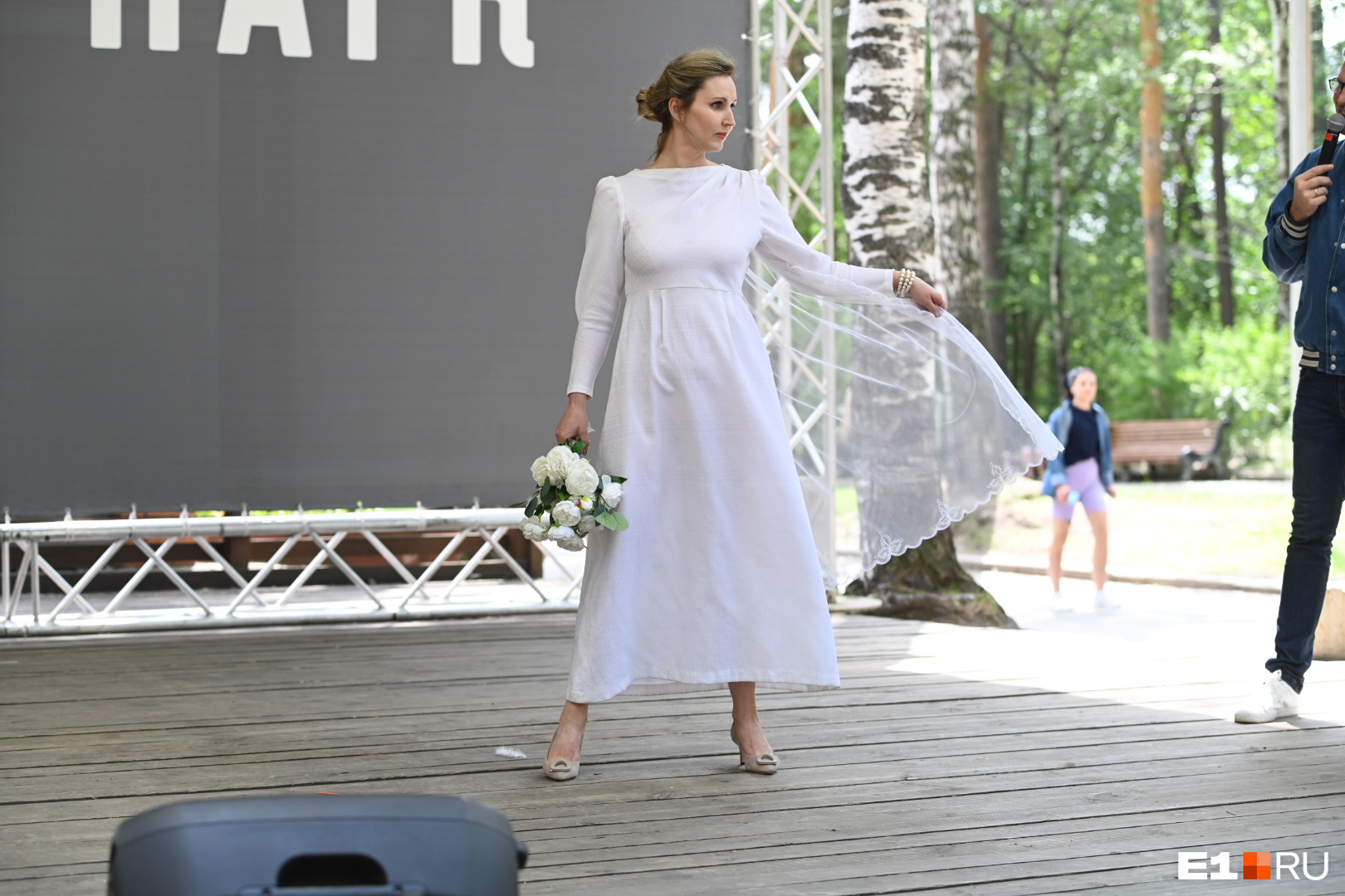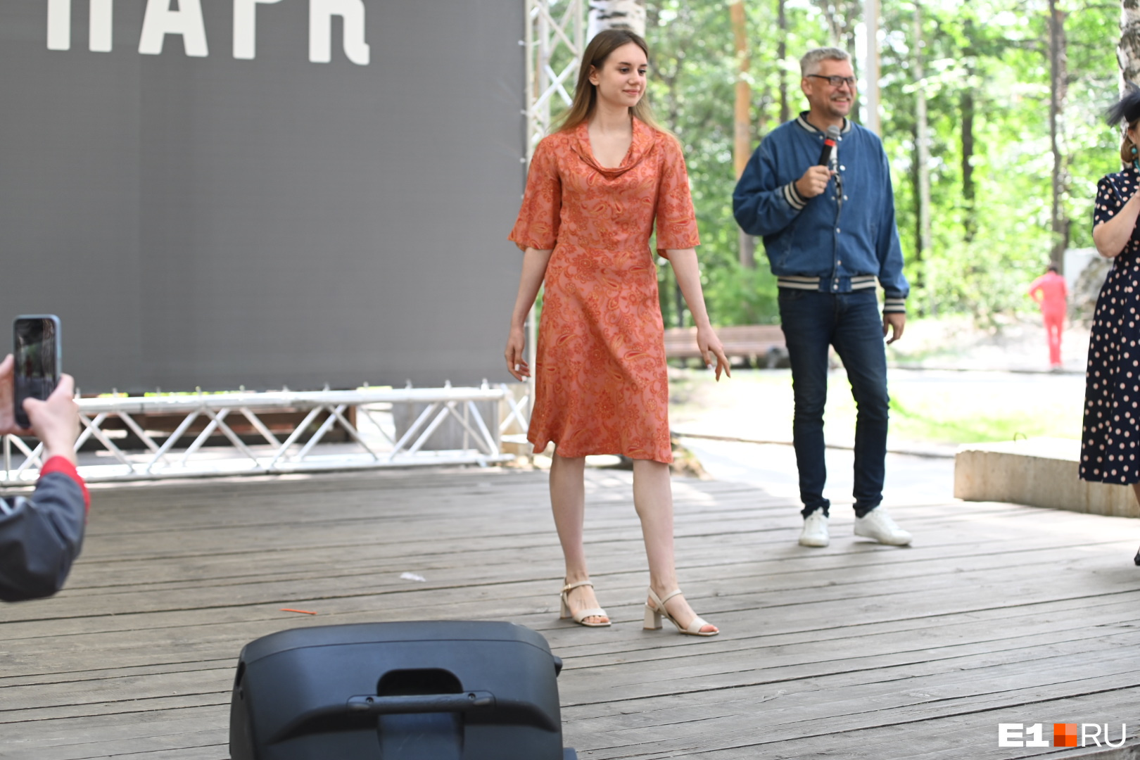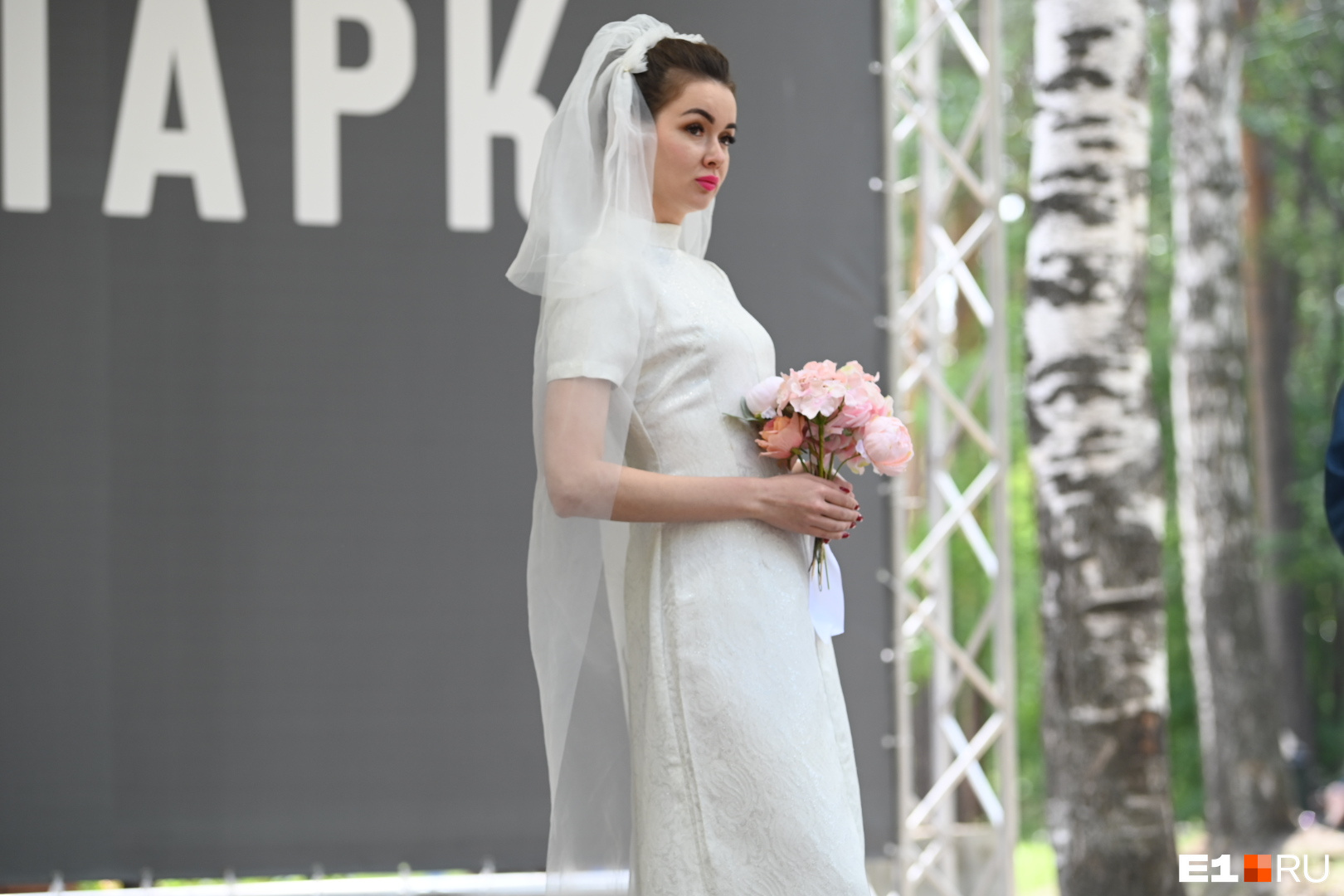 Многие екатеринбуржцы остановились возле сцены «Саундпарка». Там проходило шоу-дефиле нарядов из 1960–1980-х годов. Красотки-модели демонстрировали настоящие винтажные вещи времен СССР, а в конце девушки вышли в свадебных платьях.