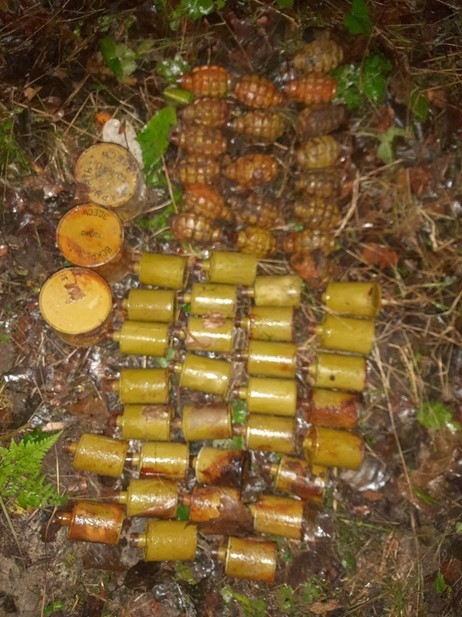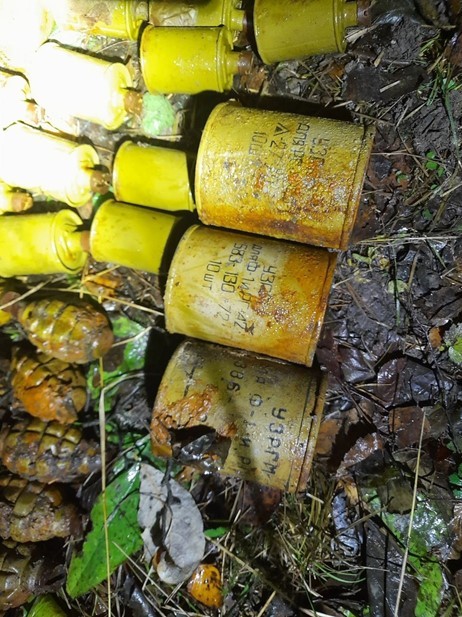 На фото: Тайник с гранатами РГ-42, Ф-1 и 60 взрывателями УЗРГМ, найденный в Петергофе, ноябрь 2024 года