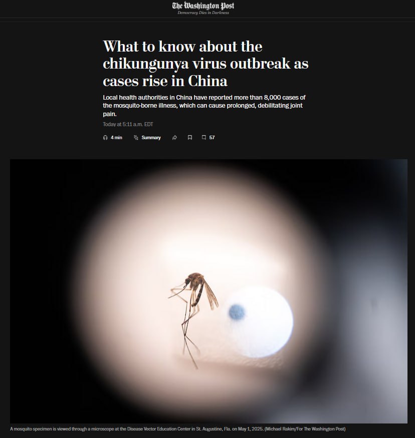 В провинции Гуандун (Южный Китай) зафиксирован мощный всплеск вируса чикунгунья — более 7 000 случаев с июня, в основном в Фошане. Это крупнейший очаг заболевания в истории континентального Китая.