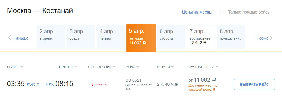 ✈️ 🇰🇿 «Россия» с 5 апреля возобновит рейсы из Шереметьева в Костанай (Казахстан). Полёты запланированы на SSJ-100 три раза в неделю — по средам, пятницам и воскресеньям.