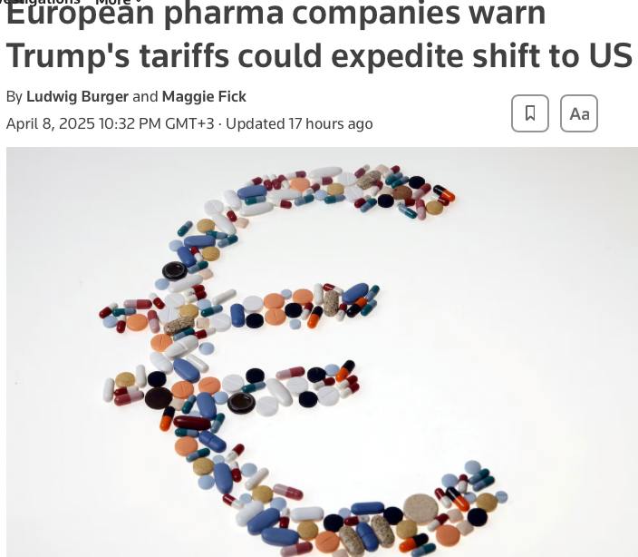 ▪️Европейские фармгиганты угрожают Еврокомиссии: из-за пошлин, введённых Трампом, начнут массово переносить заводы в США. По данным Reuters, Еврофедерация фармацевтической промышленности (EFPIA) просит фон дер Ляйен срочно реформировать правила, чтобы остановить отток инвестиций и научных центров.