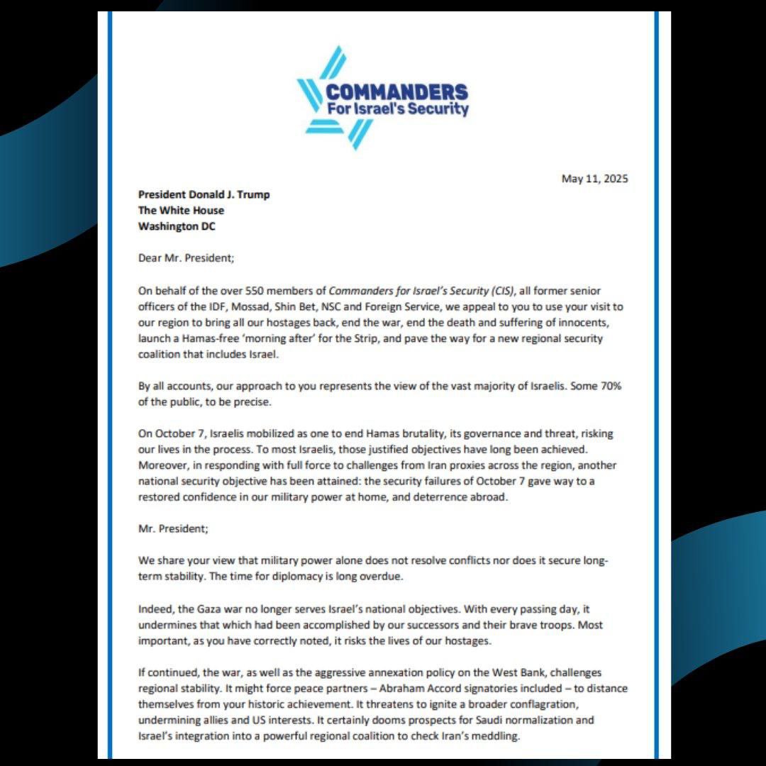 Более 550 бывших сотрудников израильских служб безопасности, включая высокопоставленных представителей Армии обороны Израиля, Моссада, ШАБАКа, Совета национальной безопасности и Министерства иностранных дел, направили письмо президенту США Дональду Трампу.