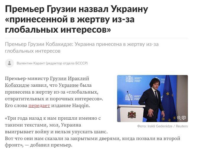 "Три года назад к нам пришли именно с такими текстами, мол, Украина выигрывает войну и нельзя упускать шанс. Вот что они нам сказали за закрытыми дверями, когда позвали на второй фронт"Премьер Грузии о советах западных чиновников грузинским властям.