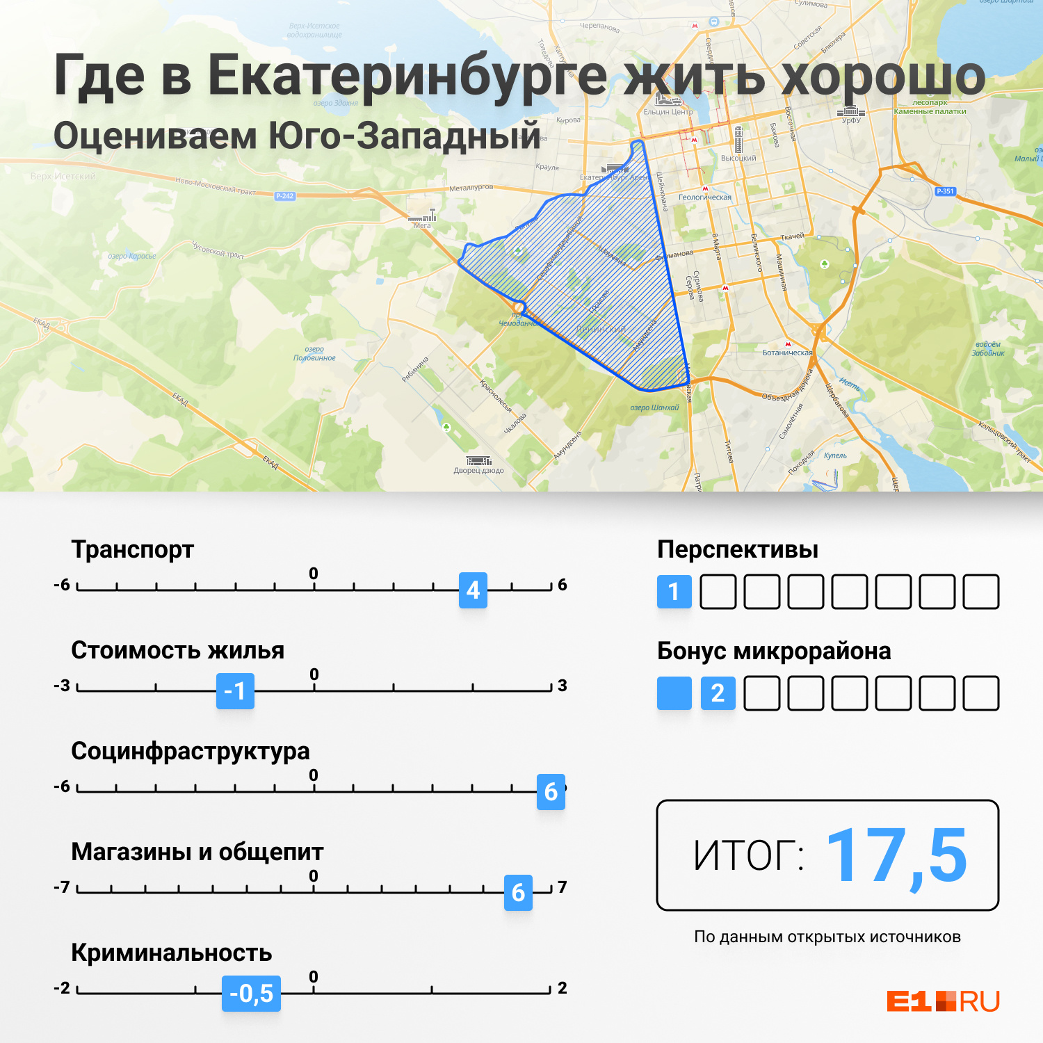 Юго-Западный — не очень-то простой микрорайон. Часть его относится к Верх-Исетскому, а часть к Ленинскому району. В этой категории мы отталкиваемся именно от официальной статистики по районам.